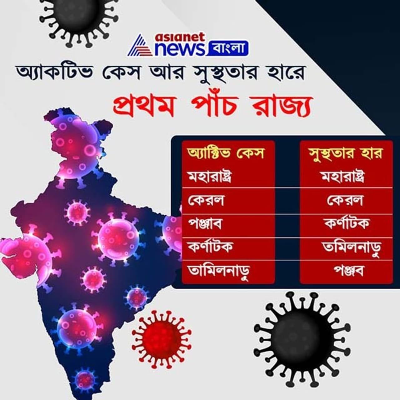 অ্যাকটিভ কেস আর সুস্থতার হারে প্রথম পাঁচ রাজ্য
