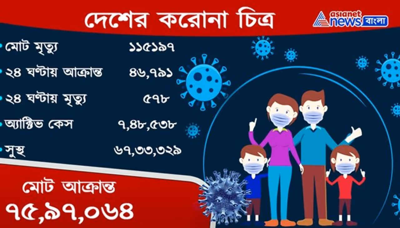 দেশে করোনাভাইরাসে আক্রান্তের সংখ্যা আরও ধীরে ধীরে করছে। গতকালের তুলনায় গত ২৪ ঘণ্টায় আক্রান্ত হয়েছেন আরও অনেক কম মানুষ। কেন্দ্রীয় স্বাস্থ্য মন্ত্রকের দেওয়া হিসেব অনুযায়ী দেশে মোট আক্রান্তের সংখ্যা ৭৫ লক্ষের বেশি। তবে গত ২৪ ঘণ্টায় আক্রান্ত হয়েছে ৪৬ হাজারেও বেশি মানুষ। এই সংখ্যাটা গতকালের তুলনায় অনেকটাই কম। যা নিয়ে রীতিমত স্বস্তির নিঃশ্বাস ফেলেছেন বিশেষজ্ঞরা। পাল্লা দিয়ে কমেছে মৃত্যুর সংখ্যা। গত ২৪ ঘণ্টায় মত্যু হয়েছে ৫৭৮ জনের।