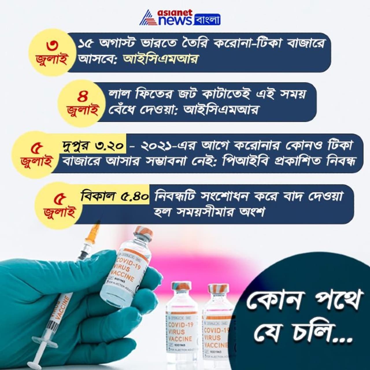ভারতে চিন সেনার অনুপ্রবেশ করেছে কি করেনি, তাই নিয়ে গত মাসে তিব্র বিতর্কে জড়িয়েছিল মোদী সরকার। বিদেশ মন্ত্রক চিন সেনার অনুপ্রবেশের দাবি করার ২৪ ঘন্টার মধ্যেই প্রধানমন্ত্রী জানিয়েছিলেন 'কেউ ভারতের মাটিতে পা রাখতে পারেনি'। করোনাভাইরাসের টিকা কবে বাজারে আসবে, তাই নিয়েও প্রায় একই রকম ধাঁধায় জড়িয়ে পড়ছে কেন্দ্র। দেশিয় কোভিড-১৯ টিকা বাজারে আসবে ১৫ অগাস্ট, আইসিএমআর এই কথা জানানোর পরের দিনই, রবিবার প্রেস ইনফরমেশন ব্যুরো বা পিআইবি ভারতীয় টিকাগুলির বিষয়ে একটি নিবন্ধে সম্পূর্ণ একটা অন্য সময়সীমার কথা জানালো। কিন্তু, খানিক পরেই আবার নিবন্ধ থেকে সেই অংশটি বাদ দেওয়া হল। কাজেই চিন সেনা ভারতে অনুপ্রবেশ করেছিল কি করেনি, এই নিয়ে ধন্দের মতো ভারতীয় করোনা টিকা কবে বাজারে আসবে, তাই নিয়েও একই রকম বিতর্ক তৈরি হল।