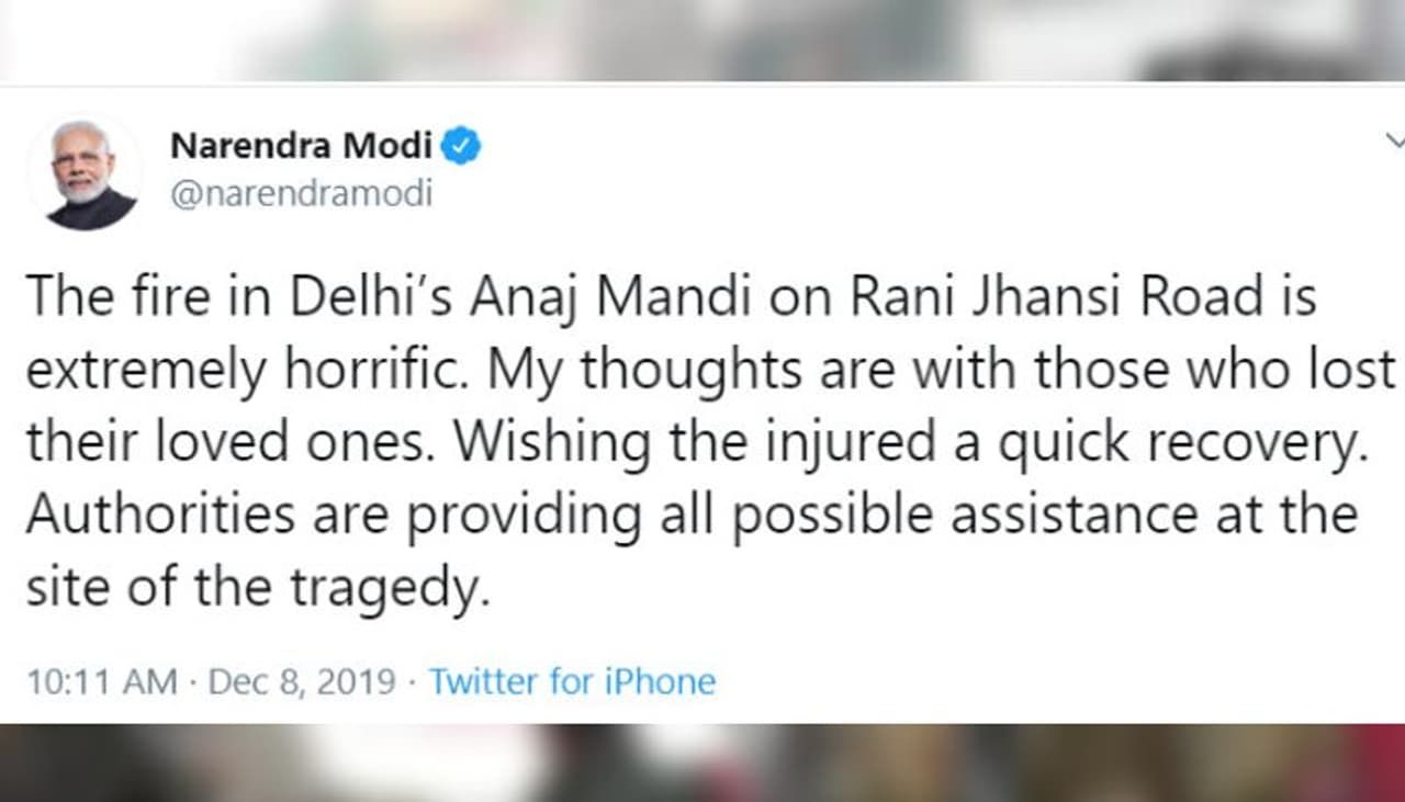 প্রধানমন্ত্রী টুইট করে বলেছেন, 'দিল্লির রানী ঝাঁসি রোডের আনাজমান্ডির অগ্নিকাণ্ড অত্যন্ত ভয়াবহ ঘটনা। যারা তাঁদের প্রিয়জনদের হারালেন, আমি তাঁদের পাশে রয়েছি। আহতদের দ্রুত সুস্থতা কামনা করছি। কর্তৃপক্ষ অকুস্থলে সম্ভাব্য সব রকম সহায়তা প্রদান করছে।'