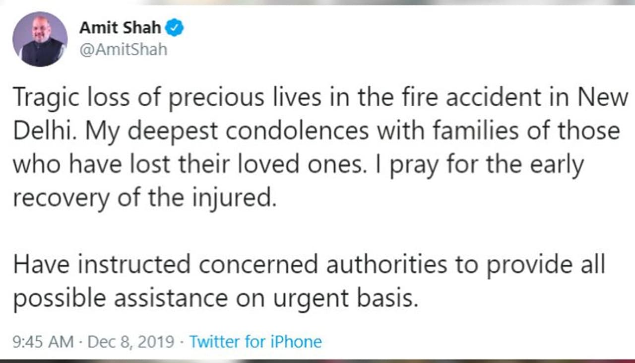 টুইট করে শোক প্রকাশ করেছেন কেন্দ্রীয় স্বরাষ্ট্রমন্ত্রী অমিত শাহ-ও। তিনি বলেছেন, 'নয়াদিল্লির অগ্নিকাণ্ডে মূল্যবান প্রাণ যাওয়াটা অত্যন্ত দুঃখজনক। স্বজনহারা হলেন যাঁরা তাঁদের প্রতি গভীর শোকপ্রকাশ করেছি। আশা করি আহতরা দ্রুত সুস্থ হয়ে উঠবেন। কর্তৃপক্ষ যাতে সব রকম সহায়তা প্রদান করে তার জন্য নির্দেশ দেওয়া হয়েছে।'