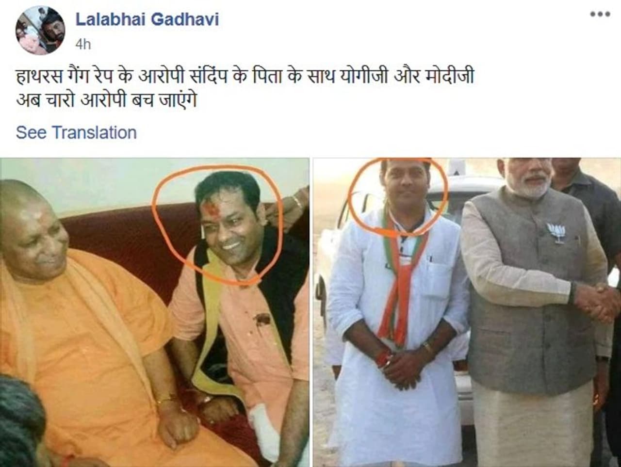 উত্তরপ্রদেশের হাথরসের নির্মম ঘটনায় দেশব্যাপী ক্ষোভ তৈরি হয়েছে। তারমধ্যেই ইন্টারনেটে বেশ কয়েকটি ছবি ভাইরাল হয়েছে, ছবিগুলিতে প্রধানমন্ত্রী নরেন্দ্র মোদী, উত্তরপ্রদেশের মুখ্যমন্ত্রী যোগী আদিত্যনাথ এবং প্রতিরক্ষামন্ত্রী রাজনাথ সিংঃএর সঙ্গে এক ব্যক্তিকে দেখা যাচ্ছে। দাবি করা হচ্ছে, ওই ব্যক্তি হাথরসের গণধর্ষণের ঘটনায় অন্যতম অভিযুক্ত সন্দীপের বাবা। আরও বলা হচ্ছে তিনি বিজেপির শীর্ষনেতাদের তিনি ঘনিষ্ঠ বলেই এখন চার আসামিকে বেঁচে যাবে।