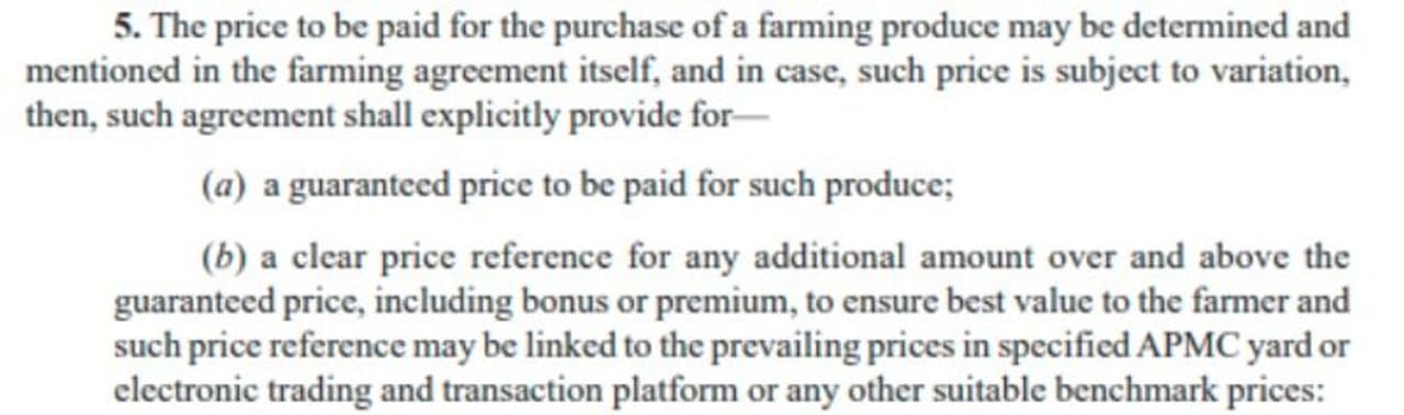 এটি বিলে উপলভ্য। মূল্য আশ্বাস ও খামার পরিষেবা আইন, ২০২০-এর কৃষকদের (ক্ষমতায়ন ও সুরক্ষা 8) চুক্তিতে রেফার পয়েন্ট নং ৫-এ গ্যারেন্টিড প্রাইস বা কোনও উপযুক্ত বেঞ্চমার্ক মূল্য অর্থাৎ এমএসপি'র উল্লেখ রয়েছে।