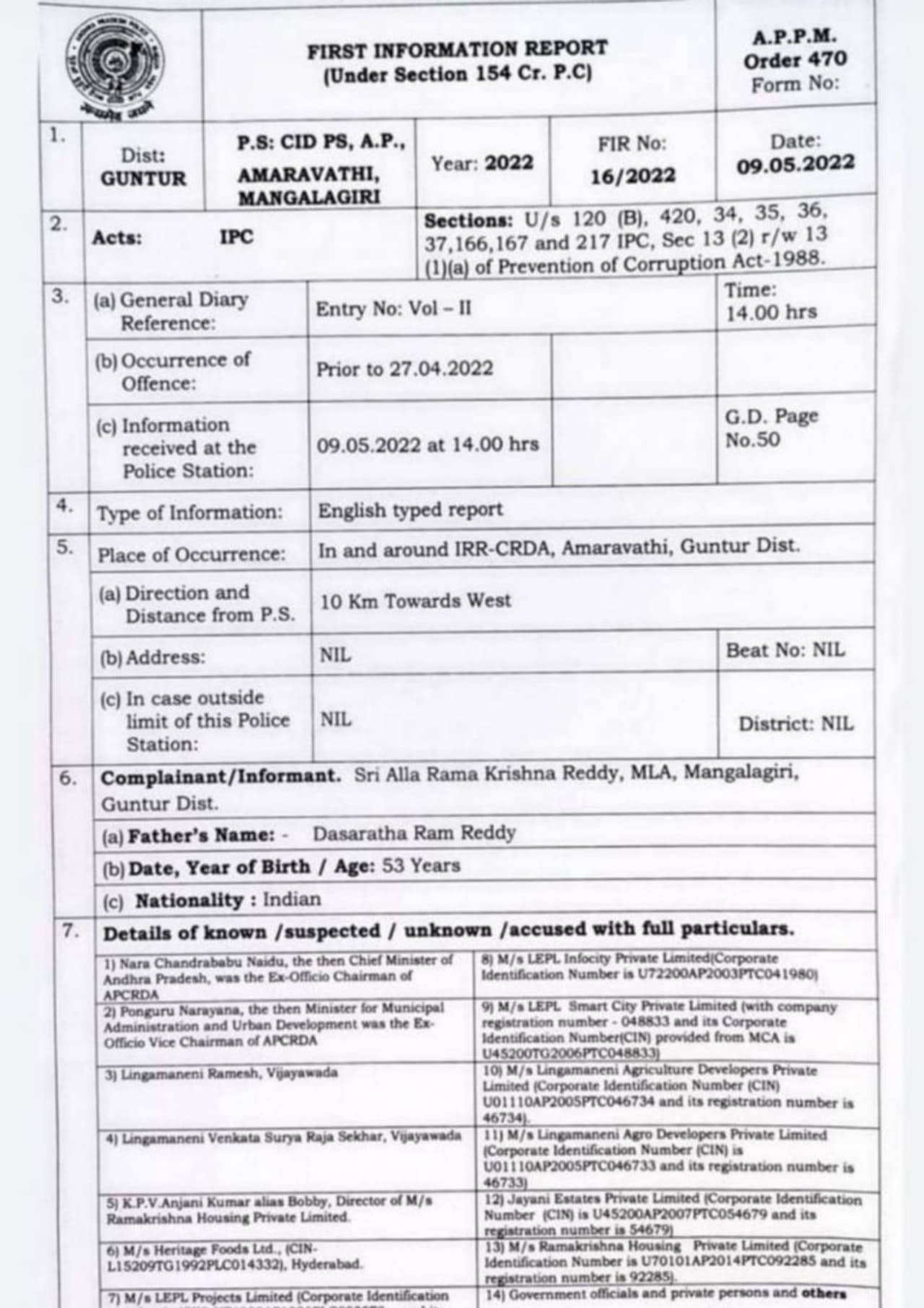 সূত্রের খবর মঙ্গলাগিরির বিধায়ক আল্লা রামকৃষ্ণ রেড্ডি চন্দ্রবাবু নাইডুর বিরুদ্ধে অমরাবতী মাস্টার প্ল্যান এবং ইনার রিং রোড ডিজাইনে অনিয়মের অভিযোগ দায়ের করেছেন।এফআইআর-এ চন্দ্রবাবু নাইডু, প্রাক্তন মন্ত্রী নারায়ণ, লিঙ্গামানেনি রমেশ, লিঙ্গামানেনি ভেঙ্কটা সূর্যরাজশেখর, ইপিএল প্রকল্প, রামকৃষ্ণ হাউজিং প্রাইভেট লিমিটেডের পরিচালক অঞ্জনি কুমার এবং হেরিটেজ ফুডসের নাম অন্তর্ভুক্ত রয়েছে।