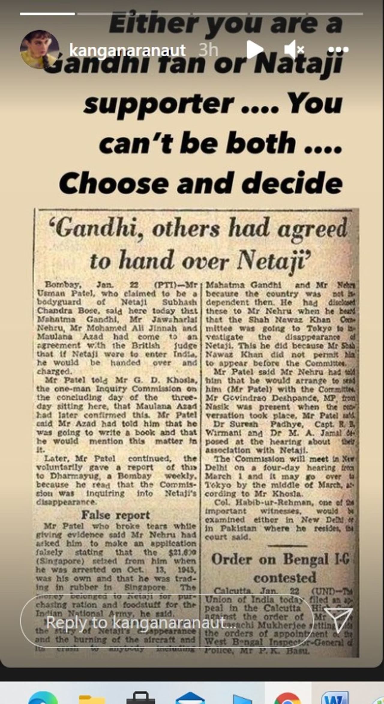 তারপর আবার বলি অভিনেত্রী ইনস্টাগ্রাম স্টোরিতে একটি পুরানো সংবাদপত্রের নিবন্ধ শেয়ার করেছেন। সঙ্গে লেখা, 'হয় আপনি গান্ধী ভক্ত অথবা নেতাজি সমর্থক। আপনি দুটো একসঙ্গে হতে পারবেন না, বেছে নিন এবং সিদ্ধান্ত নিন।' সঙ্গের সংবাদপত্রের কাটিংটি ১৯৪০ সালের একটি নিবন্ধ। তার শিরোনাম হল, 'গান্ধী, অন্যান্যরা নেতাজিকে হস্তান্তর করতে রাজি হয়েছেন।'