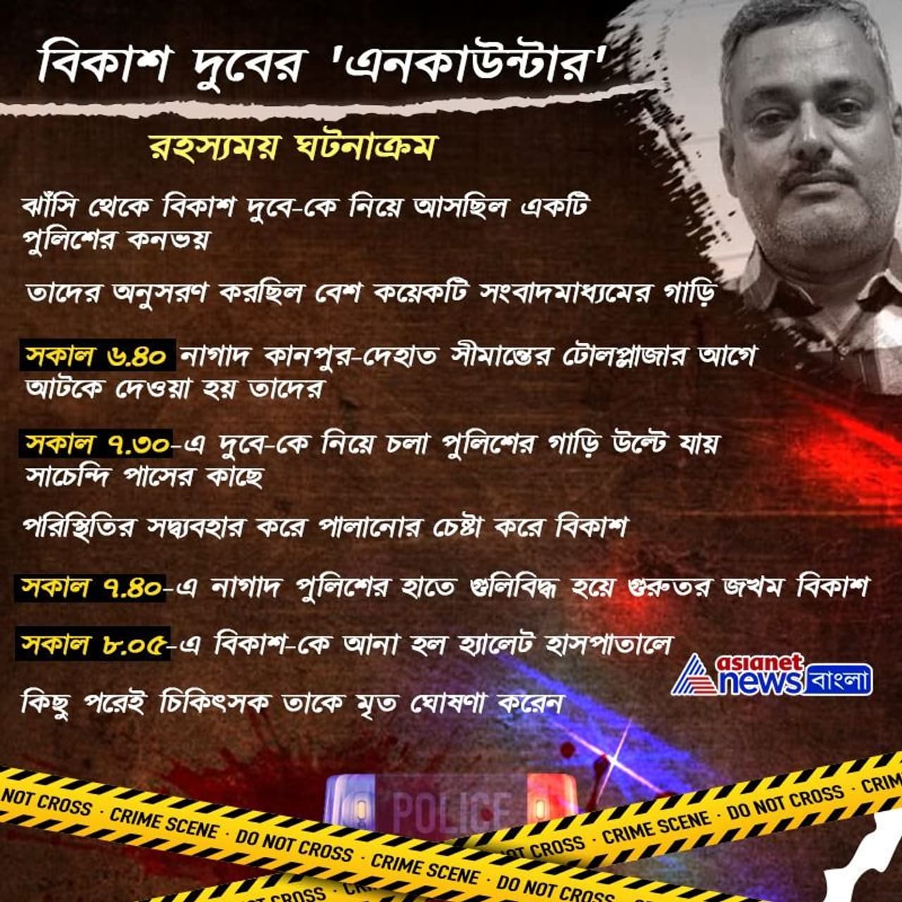বৃহস্পতিবার গ্রেফতার হয় গ্যাংস্টার বিকাশ দুবেকেশুক্রবার কানপুর আনার পথে সংঘর্ষে হল মৃত্যুকেন এই পুলিশি সংঘর্ষ ঘিরে উঠছে ষড়যন্ত্রের প্রশ্নউত্তরপ্রদেশ পুলিশের কাজে কোথায় কোথায় রয়েছে অসঙ্গতি
