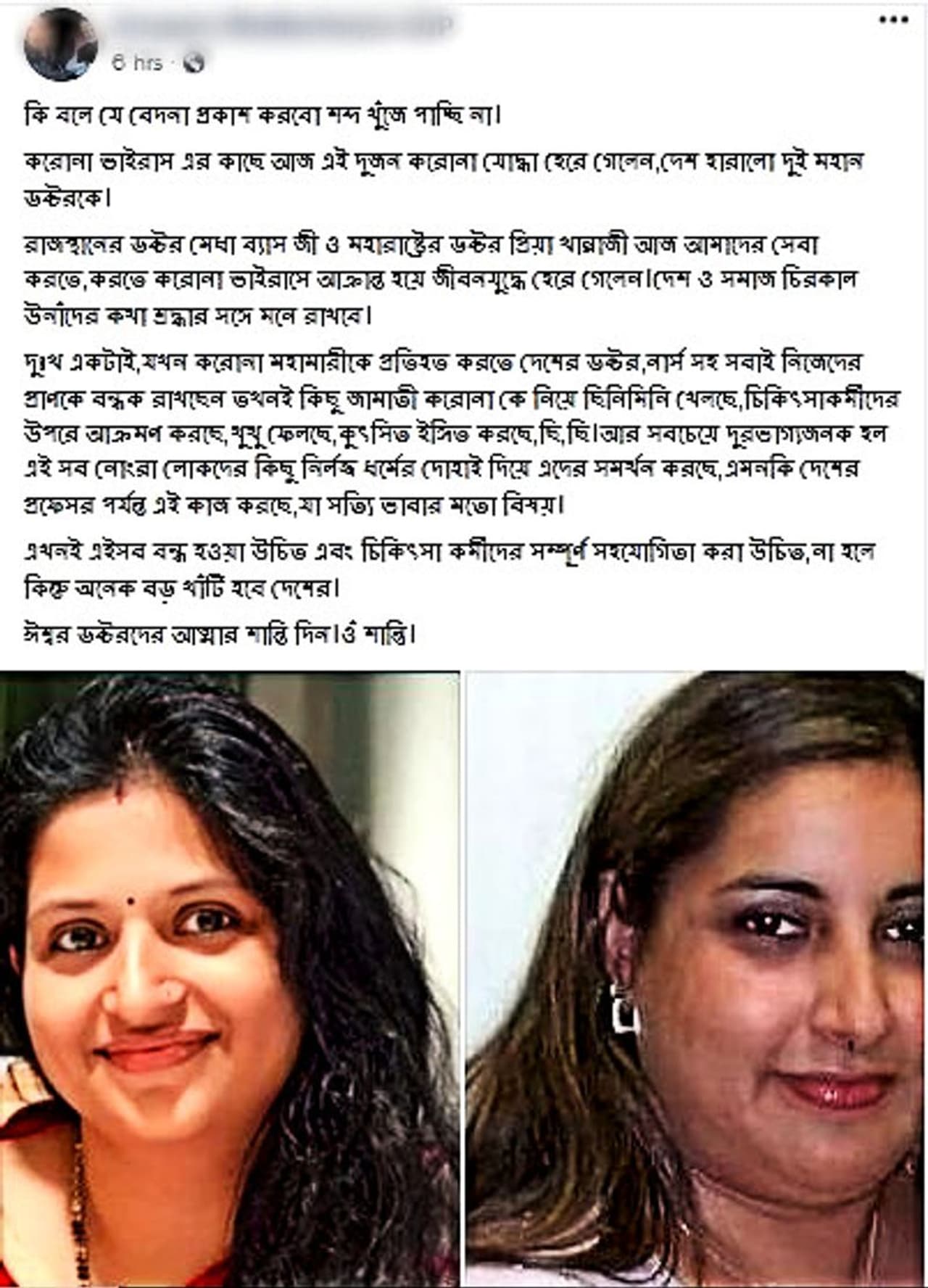 দাবি - সোশ্যাল মিডিয়ায় দুই মহিলা ডাক্তারের ছবি দিয়ে দাবি করা হচ্ছে একজন 'রাজস্থানের ডাক্তার মেধা ব্যাস' অপরজন 'মহারাষ্ট্রের ডাক্তার প্রিয়া খান্না'। দুজনেরই কোভিড-১৯'এ আক্রান্ত হয়ে মৃত্যু হয়েছে দাবি করা হচ্ছে। এখানেই শেষ নয়, এই দুই ডাক্তারকে হারানোর যন্ত্রনার আবেগের সঙ্গে জুড়ে দেওয়া হচ্ছে সাম্প্রদায়িকতার বিষ। তাবলিগি জামাত-এর দিল্লির সমাবেশ ও তারপর উত্তরপ্রদেশের কোয়ারেন্টাইন সেন্টারে এই সংগঠনের কিছু সদস্যের অশ্লীল আচরণের প্রসঙ্গ তোলা হয়েছে।