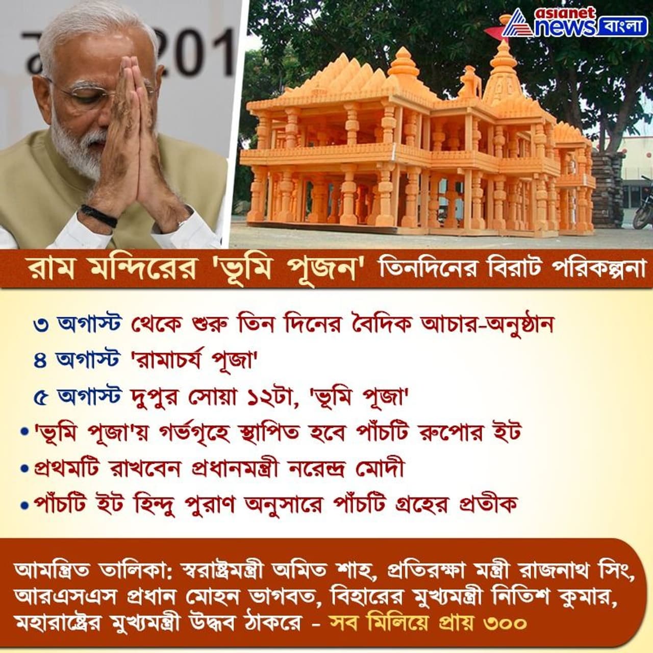 আগেই অযোধ্যার পুরোহিতরা ঘোষণা করেছেন, প্রধানমন্ত্রী নরেন্দ্র মোদী ৫ অগাস্ট রাম মন্দির নির্মাণের ভিত্তি প্রস্তর স্থাপন করবেন। জানা গিয়েছে, ৩ অগাস্ট থেকেই রাম জন্মভূমিতে বৈদিক রীতি মেনে তিন দিন ব্যাপী বিস্তৃত আচার-অনুষ্ঠান চলবে। ৪ অগাস্ট হবে 'রামাচর্য পূজা'। আর ৫ অগাস্ট-ই সেই দিন। ওই দিন দুপুর সোয়া বারোটায় অনুষ্ঠিত হবে 'ভূমি পূজা'।