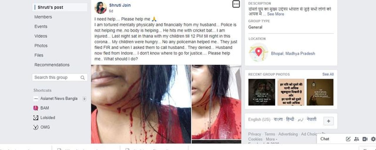 মধ্যপ্রদেশের ইন্দোরের বাসিন্দা ওই গৃহবধূ সম্প্রতি ফেসবুকে নিজের রক্তাক্ত মুখের ছবি পোস্ট করেছেন। জানিয়েছেন স্বামী ব্যাট দিয়ে মেরে এমন অবস্থা করেছে তাঁর। মহিলা ফেসবুক পোস্টে লিখেছেন, অর্থনৈতিক ও শারীরিক ভাবে তিনি স্বামীর হাতে নিয়মিত অত্যাচারিত হচ্ছেন। এই বিষয়ে পুলিশকে জানিয়েও কোনও ফল হয়নি। বরং স্বামীর অত্যাচার বেরেছে। এবার ব্যাট নিয়ে তাঁকে মারধর করে রক্তাক্ত করেছেন স্বামী। তাঁর সন্তানদের সামনেই এই মারধর করা হয়েছে। পুলিশের কাছে এফআইআর করেও কোনও ফল হয়নি। নেটিজেনদের কাছে সাহায্য চেয়েছেন ওই মহিলা।