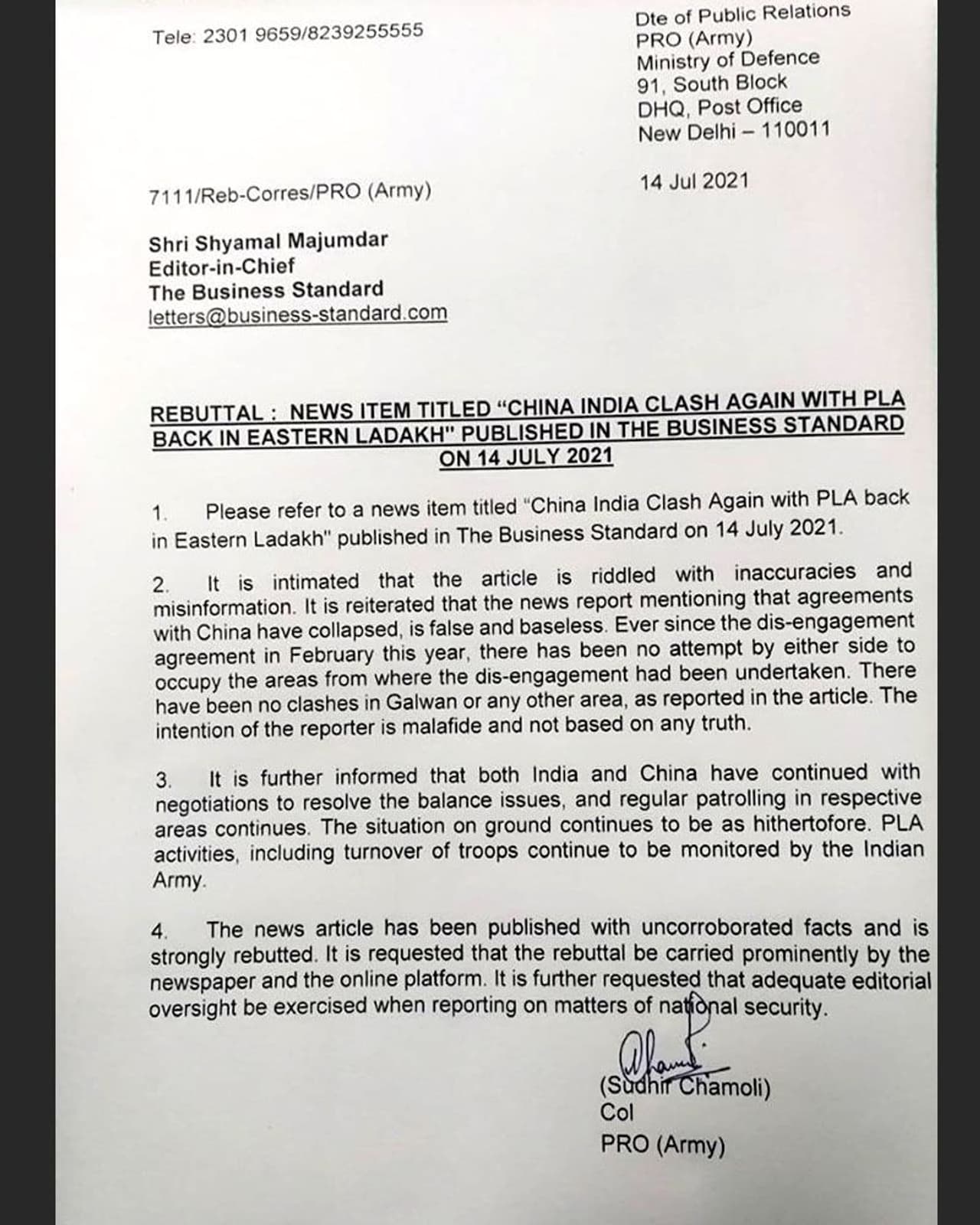 এই মিডিয়া রিপোর্ট সামনে আসতেই কড়া প্রতিক্রিয়া ব্যক্ত করে ভারতীয় সেনা। এই রিপোর্টকে তারা ভিত্তিহীন বলে দাবি করার সঙ্গে সঙ্গে বিজনেস স্ট্যান্ডার্টের এডিটর শ্যামল মজুমদার-কে একটি চিঠিও দিয়েছে। সেই চিঠির একটি প্রতিলিপি সেনাবাহিনী সূত্রে এশিয়ানেট নিউজের হাতেও এসেছে।