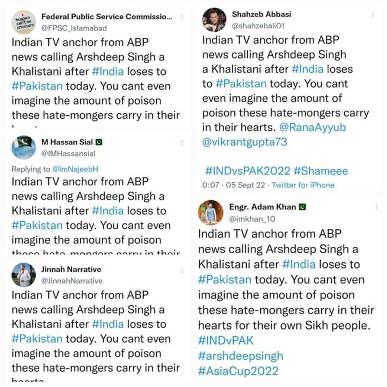 আনশুল জানান "ভারত পাকিস্তানের কাছে হেরে যাওয়ার পর ভারতীয় টিভি উপস্থাপক আরশদীপ সিংকে খালিস্তানি বলেছেন। ভাবতেও পারবেন না এই বিদ্বেষীরা নিজের ভেতরে কতটা বিষ ভরেছে"। এই একই টুইটটি অনেক অ্যাকাউন্টে শেয়ার করা হয়েছে। বিতর্কিত সাংবাদিক রানা আইয়ুবকেও একটি টুইটে ট্যাগ করা হয়েছে। ফেডারেল পাবলিক সার্ভিস কমিশন (@FPSC_Islamabad), এম হাসান সিয়াল (@IMHassansial) এর মতো অনেক অ্যাকাউন্ট এগুলি শেয়ার করা হয়েছে৷