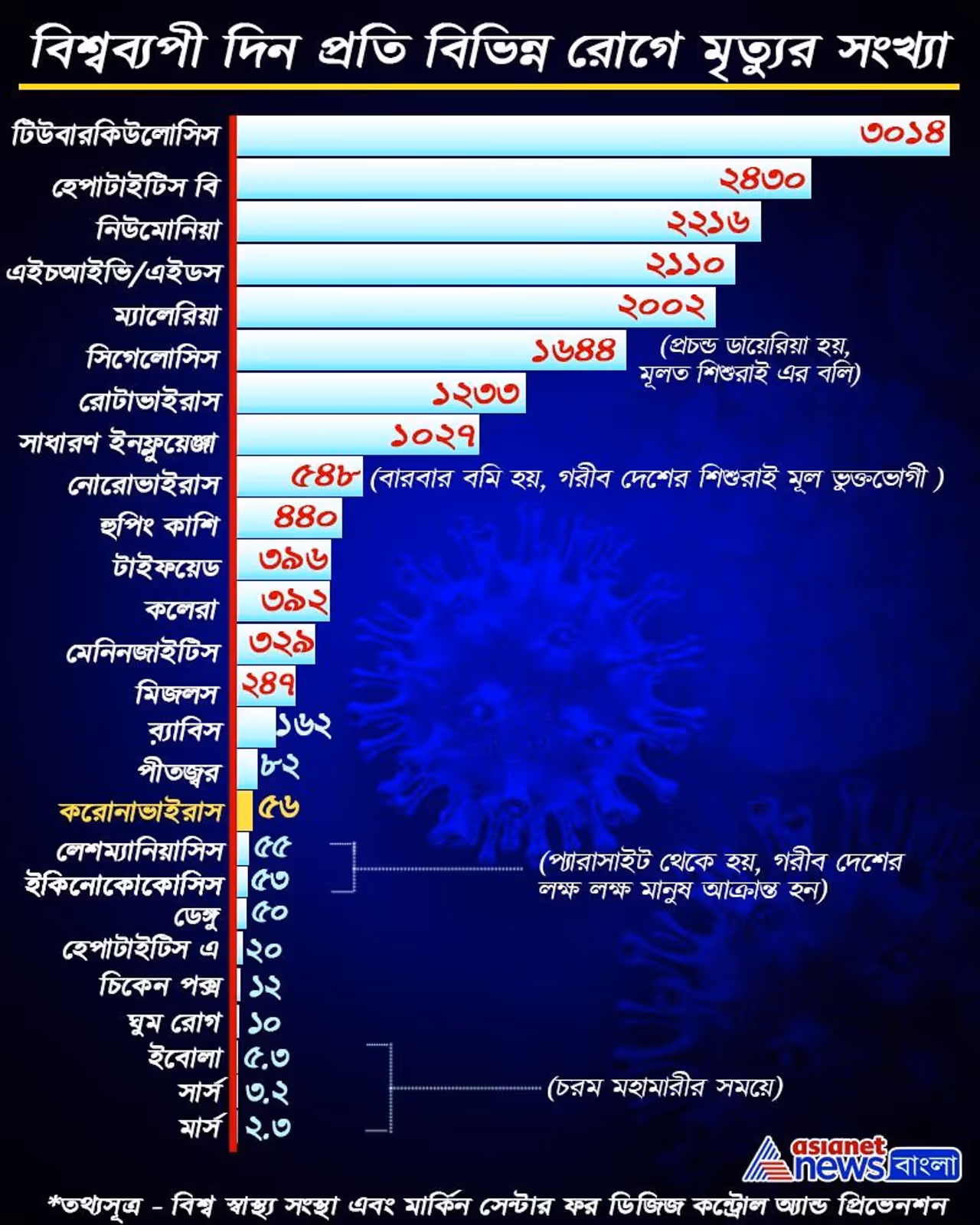 তাদের দেওয়া তথ্য অনুযায়ী, প্রতিদিন পৃথিবীতে টিবি, নিউমোনিয়া, এইচআইভি, ম্য়ালেরিয়া, কলেরা, টাইফয়েড, মেনিনজাইটিস, হুপিং কাশি, এমনকী যে মরসুমী জ্বর হয় - তাতেও একেকদিনে করোনাভাইরাসের থেকে অনেরক গুণ বেশি মানুষেরর মৃত্যু হয়ে থাকে। তথ্য অনুযায়ী, এখনও পর্যন্ত করোনার হানায় প্রতিদিন গড়ে ৫৬ জনের মৃত্যু হয়েছে। সেখানে মরসুমী জ্বরেই মারা যান প্রতিদিন ১০২৭ জন।