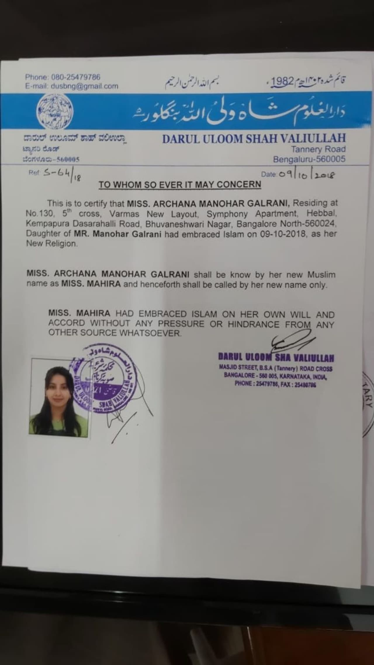 কন্নর ফিল্ম ইন্ডাস্ট্রিতে সনজনা গালরাণী নামে পরিচিত হলেও এই অভিনেত্রীর আসল নাম অর্চনা মনোহর গালরানি। এখানেই শেষ নয়। জানা যাচ্ছে দু'বছর আগে ইসলাম গ্রহণ করেছিলেন এবং নিজের নাম পরিবর্তন করে মাহিরা রাখেন।