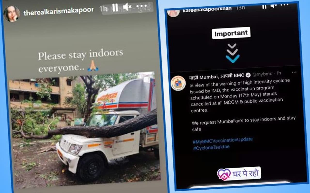 একইভাবে সতর্ক করেছেন করিনা কাপুর। ঘূর্ণিঝড়ের আগাম পূর্বাভাস লক্ষ করেই তিনি সোশ্যাল মিডিয়ায় সকলকে সাবধান থাকার আর্জি জানান। পাশাপাশি তিনি আরও জানান, ঘূর্ণিঝড়ের কোপের আগাম সতর্কতার জন্য স্থগীত রাখা হল মুম্বইয়ের টিকাকরণ। বিএমসি থেকে তা জানানো হয়। সেই গুরুত্বপূর্ণ তথ্য সোশ্যাল মিডিয়ায় শেয়ার করেন করিনা কাপুর।