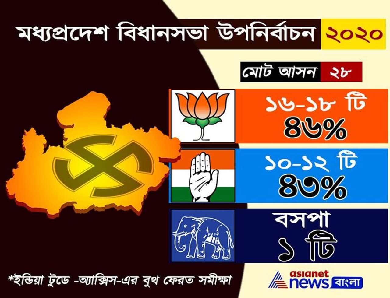 ২৮টি বিধানসভা আসনে উপনির্বাচন হয়েছিল মধ্যপ্রদেশে, ইন্ডিয়া টুডের বুথ ফেরত সমীক্ষায় দাবি করা হচ্ছে যে এখানে ২৮টি আসনের মধ্যে বিজেপি ১৬ থেকে ১৮টি আসন পাওয়ার সম্ভাবনা রয়েছে, কংগ্রেস পেতে পারে ১০ থেকে ১২টি আসন, যদিও, উপনির্বাচনের আগে এই ২৮টি আসনই কংগ্রেসের দখলে ছিল।