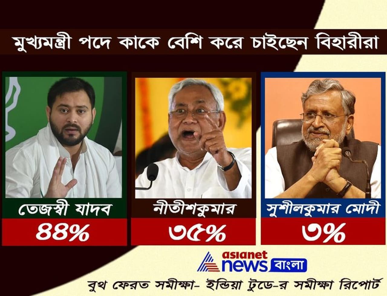 বিহারের ৪৪ শতাংশ মানুষ চাইছেন নয়া মুখ্যমন্ত্রী হোন লালুপুত্র এবং রাষ্ট্রীয় জনতা দলের নেতা তেজস্বী যাদব, নীতীশকুমারকে মুখ্যমন্ত্রী পদে নাকি চাইছেন ৩৫ শতাংশ মানুষ এবং সুশীলকুমার মোদীকে মুখ্যমন্ত্রী পদে চাইছেন মাত্র ৩ শতাংশ মানুষ।