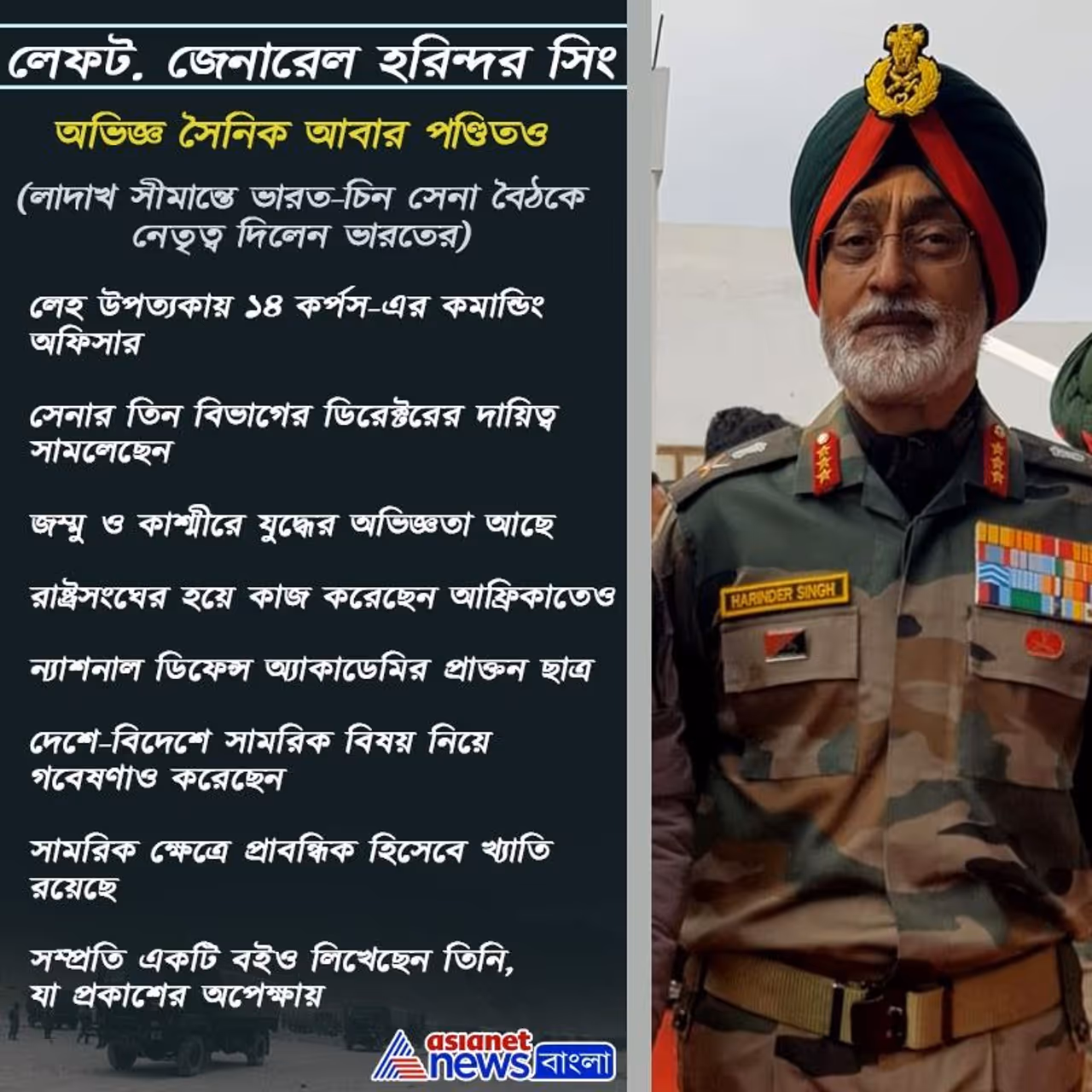পূর্ব লাদাখের শনিবার হল ভারত ও চিন সামরিক বৈঠকভারতীয় বাহিনীর নেতৃত্ব দিলেন লেফটেন্যান্ট জেনারেল হরিন্দর সিংজম্ম-কাশ্মীরের পাশাপাশি আফ্রিকাতেও যুদ্ধের অভিজ্ঞতা আছে তাঁরআবার সামরিক বিষয়ে পণ্ডিত-ও