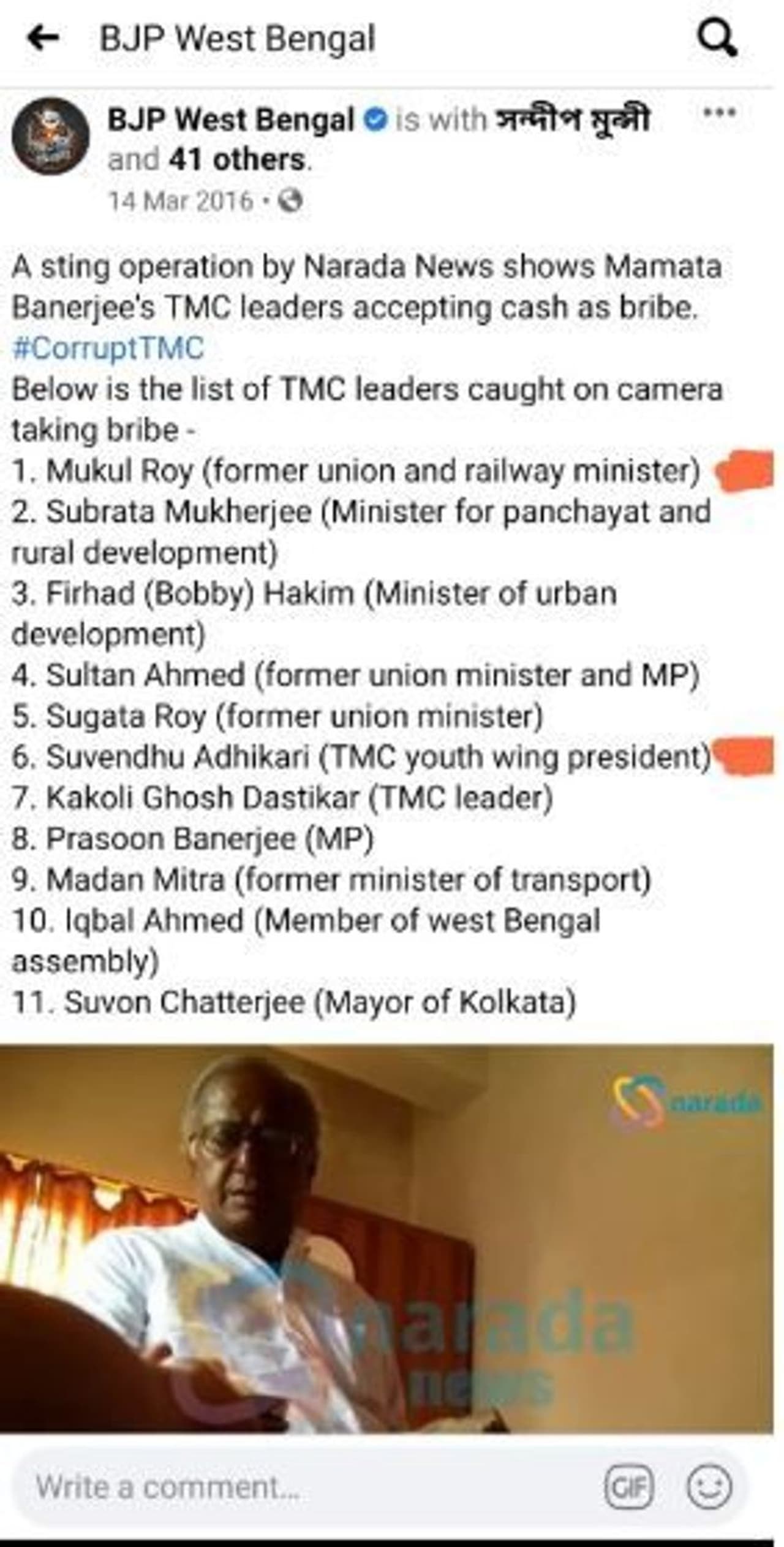 বঙ্গ বিজেপি তাদের ফেসবুক পেজ থেকে ভিডিওটি সরায়নি। তাদের টাইমলাইনে ২০১৬ সালে নারদ স্টিং অপারেশনে অভিযুক্ত রাজনৈতিক নেতাদের নামের তালিকা সম্বলিত দিয়ে একটি পোস্টও রয়ে গিয়েছে। সেখানেও জ্বলজ্বল করছে মুকুল রায়, শুভেন্দু অধিকারী ও শোভন চট্টোপাধ্যায়ের নাম। প্রসঙ্গত ২০১৬ সালের পশ্চিমবঙ্গ বিধানসভা নির্বাচনের আগেই নারদ নিউজ পোর্টালের সাংবাদিক ম্যাথু স্যামুয়েলস ওই স্টিং অপারেশনের ভিডিওটি প্রকাশ করেছিলেন।