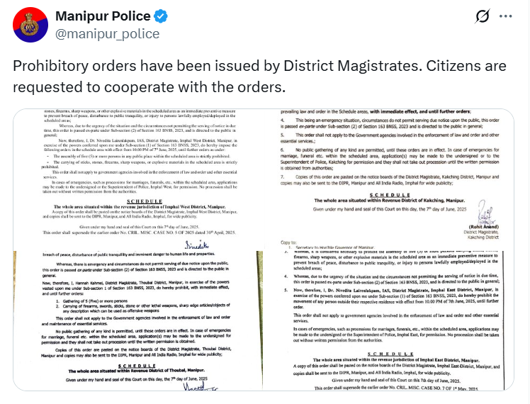এদিকে, বিষ্ণুপুর জেলায় ৭ জুন, ২০২৫ তারিখ রাত ১১:০০ টা থেকে পরবর্তী আদেশ না দেওয়া পর্যন্ত সম্পূর্ণ কারফিউ জারি করা হয়েছে। আইনশৃঙ্খলা পরিস্থিতির অবনতির কারণে পূর্বে জারি করা কারফিউ শিথিল করার আদেশ বাতিল করা হয়েছে।