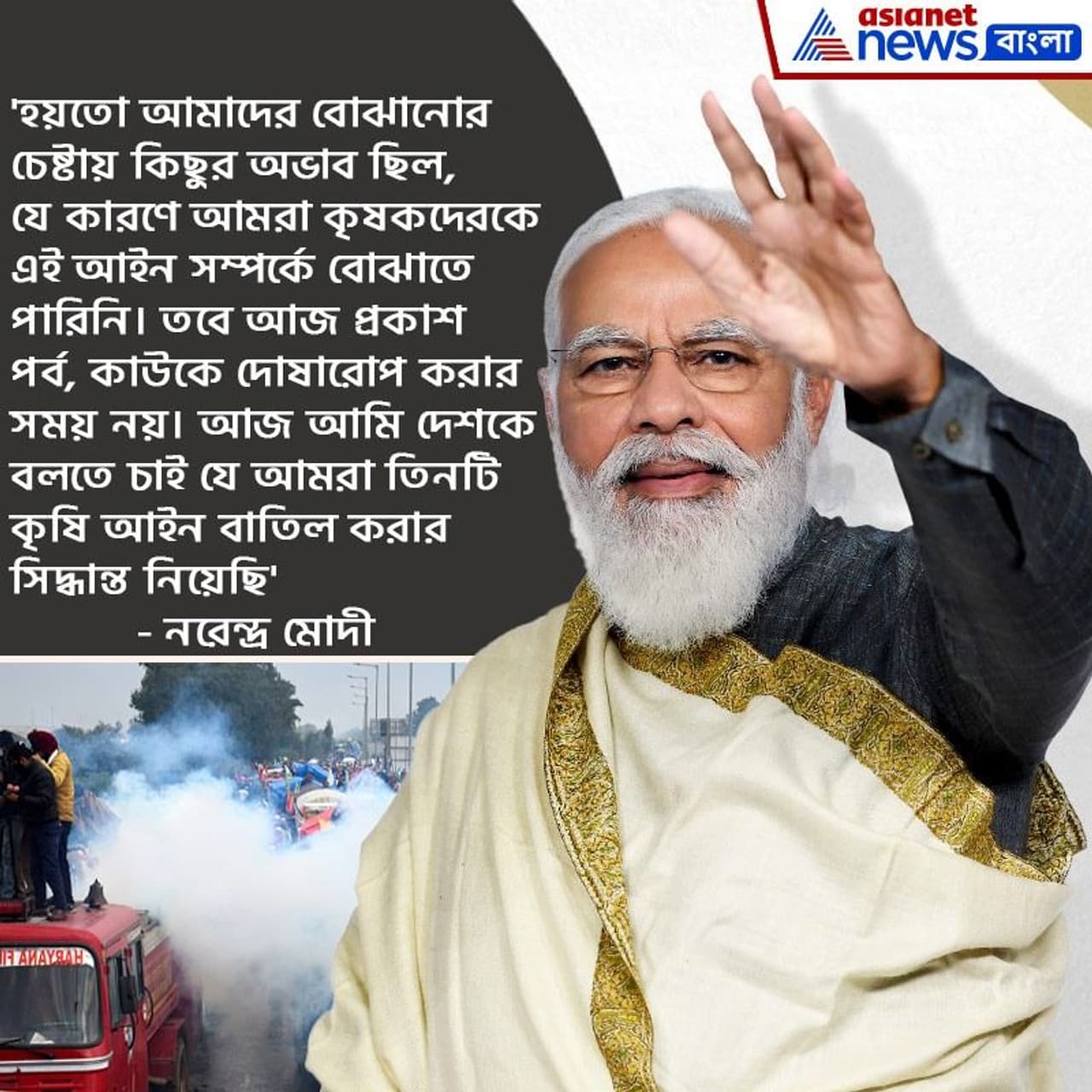 ধর্মগুরু গুরু নানকের জন্মজয়ন্তীতে (Guru Nanak Jayanti) বিরাট সিদ্ধান্ত মোদি সরকারের। প্রায় এক বছরের কৃষক আন্দোলনের পর সিদ্ধন্ত বদল করল কেন্দ্রীয় সরকার (Central Got)। তিনটি বিতর্কিত কৃষি আইন প্রত্যাহারের কথা ঘোষণা করলেন প্রধানমন্ত্রী নরেন্দ্র মোদি (PM Narendra Modi)। বিতর্কিত এই তিনটি কৃষি আইন প্রকাশ্যে আসার পর থেকে দেশ জুড়ে উত্তেজনার সৃষ্টি হয়। কেন্দ্রের কৃষি আইনের (Farm Bills) বিরোধিতা করে দেশ জুড়ে কৃষকরা বিক্ষোভে সামিল হয়। দীর্ঘ প্রতীক্ষার পরও তাদের এই আন্দোলন জারি রেখেছেন কৃষকরা (Farmers)।