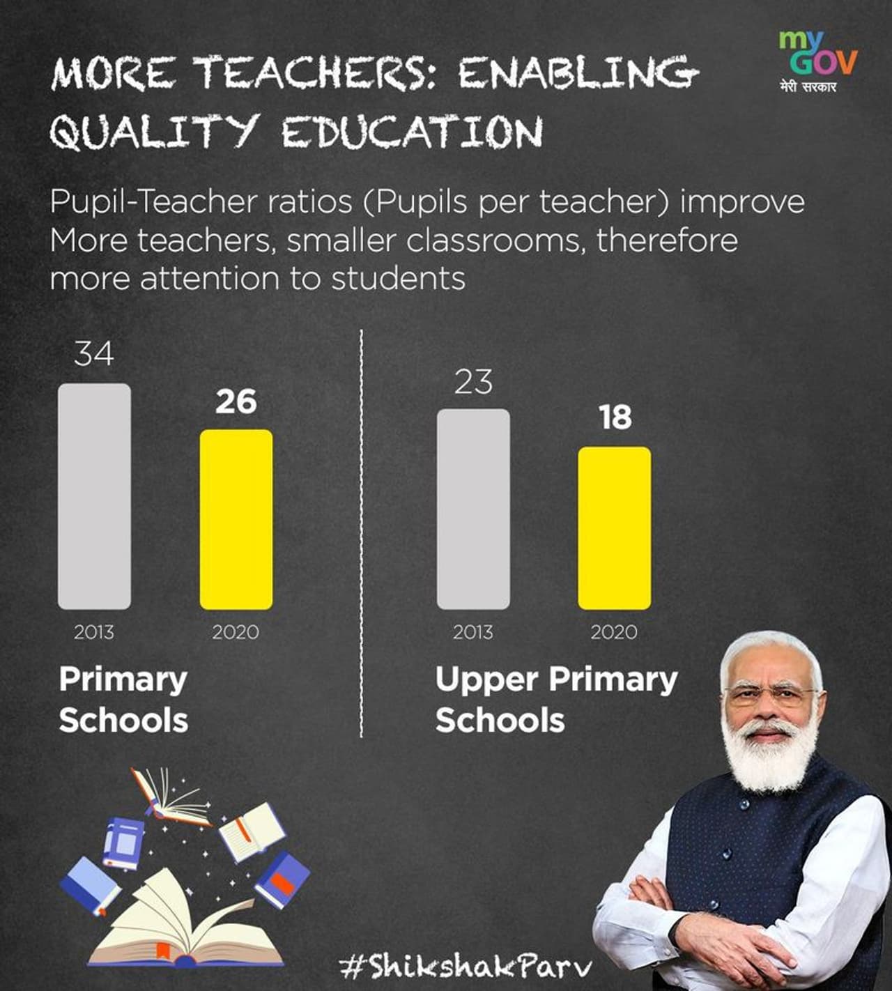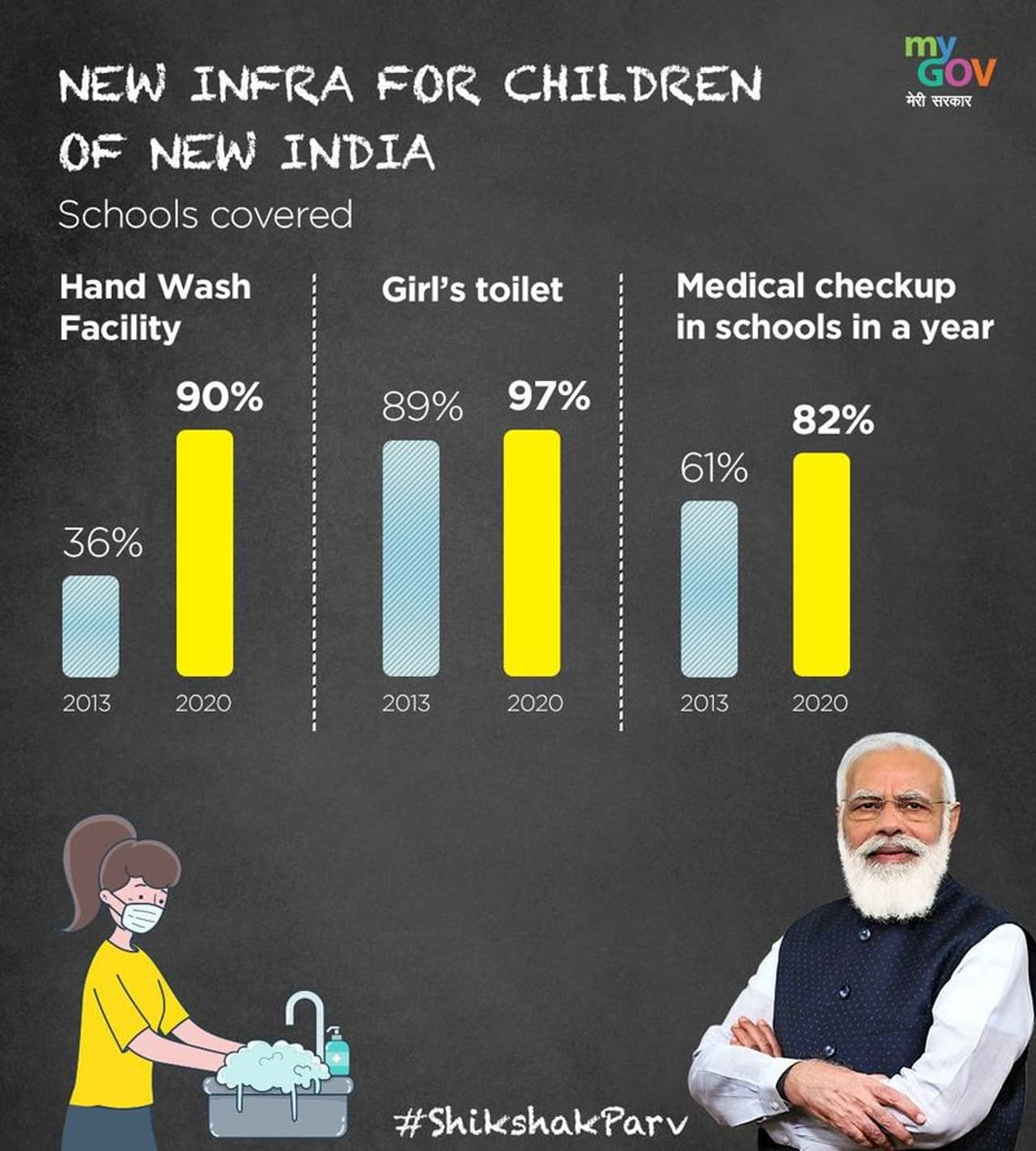 মোদী সরকার উচ্চ শিক্ষার পাশাপাশি গত সাত বছরে জোর দিয়েছে শিশু শিক্ষার ওপরেও। মাধ্যমিক আর উচ্চমাধ্যমিক শিক্ষা ব্যবস্থার উন্নতিতেও বিশেষ নজর দেওয়া হয়েছে। কেন্দ্রীয় সরকারে তথ্য অনুযায়ী ঢেলে সাজান হয়েছে স্কুলগুলি। স্কুলছুট বন্ধ করতেও বিশেষ নজর দেওয়া হয়েছে।