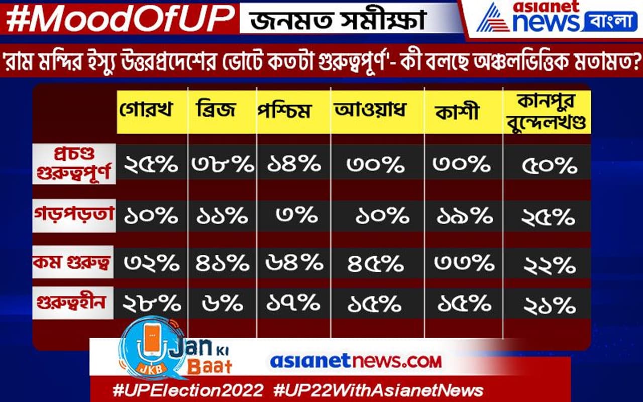 হ্যাসট্যাগ মুড অফ ইউপি (#MoodOfUP)- সমীক্ষা-কে মোট ছয়টি জোনে ভাগ করা হয়েছিল। এই ছয়টি জোনে রামমন্দির ইস্যু নিয়ে কোন অঞ্চলের মানুষ কী রায় দিয়েছেন- তা একনজরে দেখে নেওয়া যাক। উত্তরপ্রদেশে আসন্ন বিধানসভা নির্বাচনে রামমন্দিরকে প্রচণ্ড গুরুত্বপূর্ণ বলে মনে করছে কানপুর-বুন্দেলখণ্ডের মানুষ। এই অঞ্চল থেকে সমীক্ষায় অংশ নেওয়া মানুষদের মধ্যে ৫০ শতাংশ দাবি করেছেন রামমন্দির এবারের ভোটে খুবই গুরুত্বপূর্ণ ইস্যু। ব্রিজ অঞ্চলের উত্তরদাতাদের মধ্যে ৩৮ শতাংশ একই দাবি করেছেন। এদের পিছনে যথাক্রমে রয়েছে আওয়াধ, কাশি ও গোরখ এবং পশ্চিম। আওয়াধ ও কাশির ৩০ শতাংশ করে উত্তরদাতা রামমন্দিরকে ভোটে গুরুত্বপূর্ণ ইস্যু বলে মেনেছেন। গোরখের ২৫ শতাংশ এবং পশ্চিমের ১৪ শতাংশ মানুষ একই দাবি করেছেন। ভোটে রামমন্দিরকে গড়পড়তা ইস্যু দাবি করার তালিকায় সবার উপরে রয়েছে কানপুর-বুন্দেলখণ্ড। এখানকার ২৫ শতাংশ মানুষ রামমন্দির ইস্যুকে গড়পড়তা বলে মানছেন। কাশি-র ১৯ শতাংশ, আওয়াধের ১০ শতাংশ, গোরখের ১০ শতাংশ, ব্রিজের ১১ শতাংশ এবং পশ্চিমের ৩ শতাংশ মানুষ-ও রামমন্দিরকে গড়পড়তা বলে মানছেন। রামমন্দিরকে কম গুরুত্বপূর্ণ ইস্যু বলার তালিকায় শতাংশের হিসাবটা এরকম- গোরখ- ৩২ শতাংশ, ব্রিজ ৪১ শতাংশ, পশ্চিম ৬৪ শতাংশ, আওয়াধ ৪৫ শতাংশ, কাশি ৩৩ শতাংশ এবং কানপুর-বুন্দেলখণ্ড ২২ শতাংশ। এক্কেবারে গুরুত্ব নেই বলছেন- গোরখের- ২৮ শতাংশ, ব্রিজের ৬ শতাংশ, পশ্চিমের ১৭ শতাংশ, আওয়াধের ১৫ শতাংশ, কাশির ১৫ শতাংশ এবং কানপুর-বুন্দেলখণ্ডের ২১ শতাংশ মানুষ।