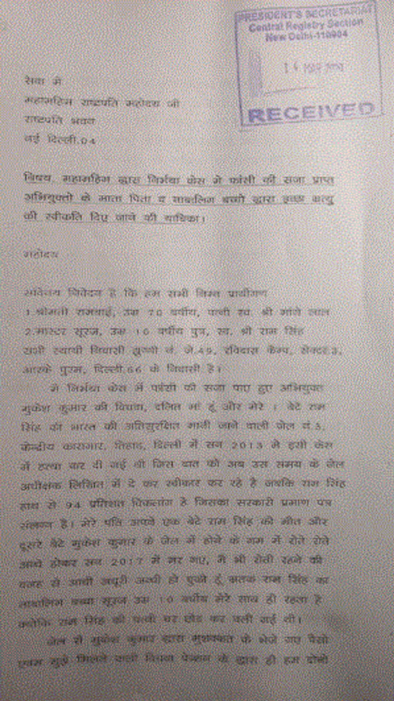 ২০ মার্চ নির্ভয়ার ৪ দোষীর ফাঁসি তার আগে নতুন পন্থা অবলম্বন দোষীদের পরিবারের রাষ্ট্রপতির কাছে চিঠি অপরাধীদের পরিবারের ১৩জন সদস্য হিন্দিতে লিখলেন চিঠি