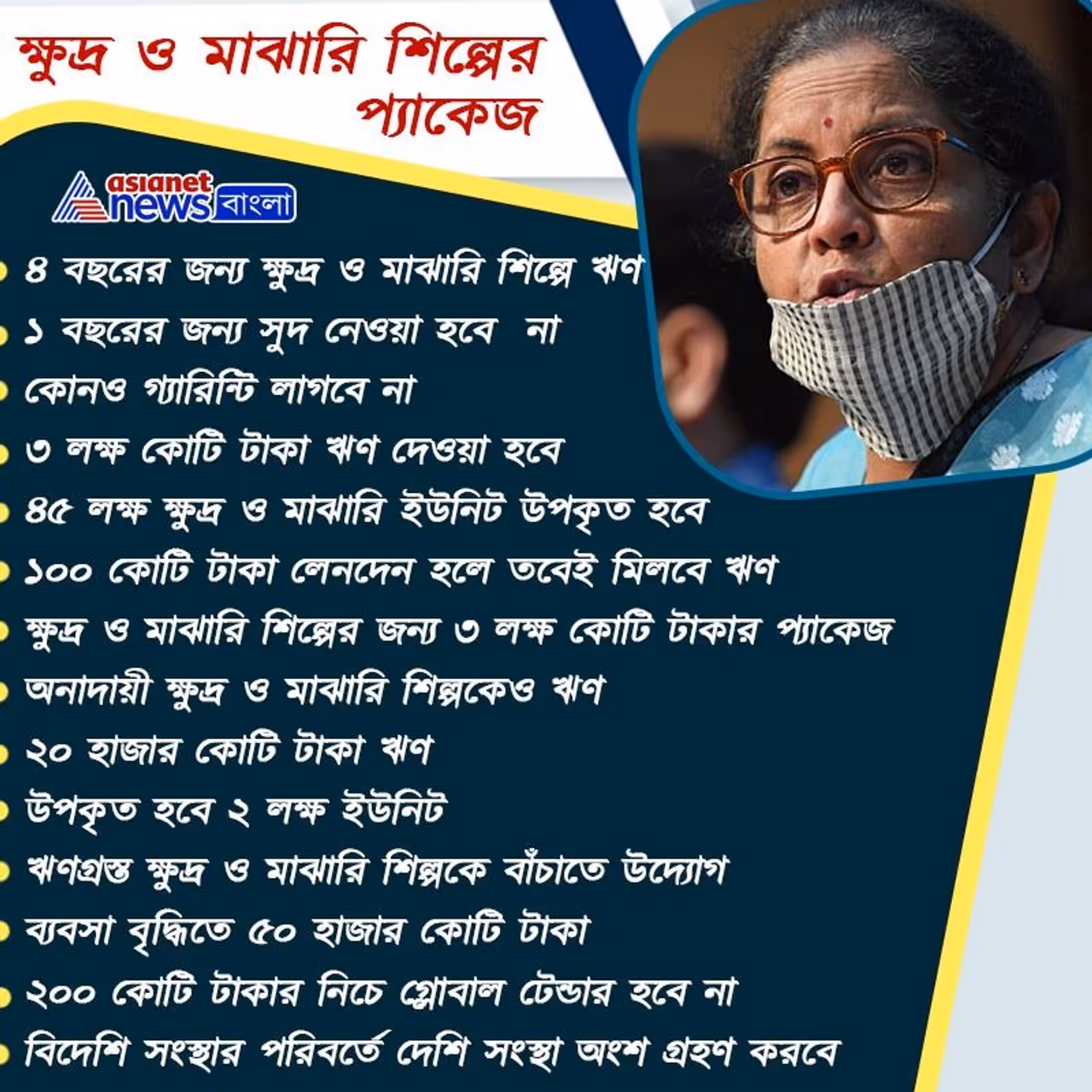 ক্ষুদ্র মাঝারি ও কুটীর শিল্পগুলিতে ৪ বছরের মেয়াদে ৩ লক্ষ কোটি টাকার ঋণ দেওয়ার কথা ঘোষণা করেছেন কেন্দ্রীয় অর্থমন্ত্রী। আগামী ৩১ অক্টোরবর পর্যন্ত এই ঋণ গ্রহণের মেয়াদ থাকবে।