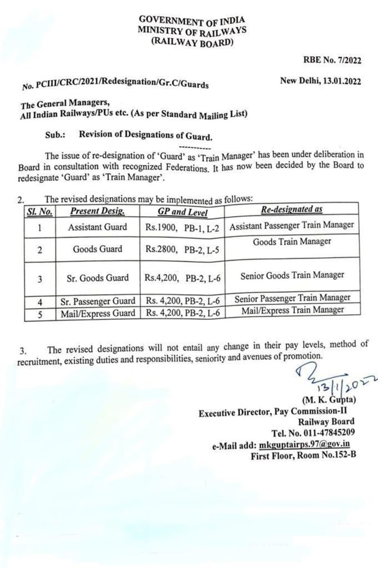 সিনিয়র গুডস গার্ডকে সিনিয়র পণ্য ট্রেন ম্যানেজার হিসাবে চিহ্নিত করা হবে। সিনিয়র প্যাসেঞ্জার গার্ডকে এবার থেকে সিনিয়র প্যাসেঞ্জার ট্রেন ম্যানেজার বলে অভিহিত করা হবে।