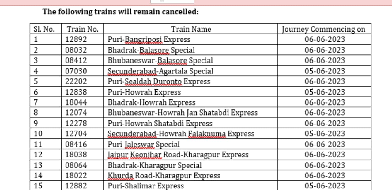 এই ট্রেনগুলি বাতিল করা হয়েছে (০৫.০৬.২০২৩ তারিখে যাত্রা শুরু হওয়ার কথা ছিল)