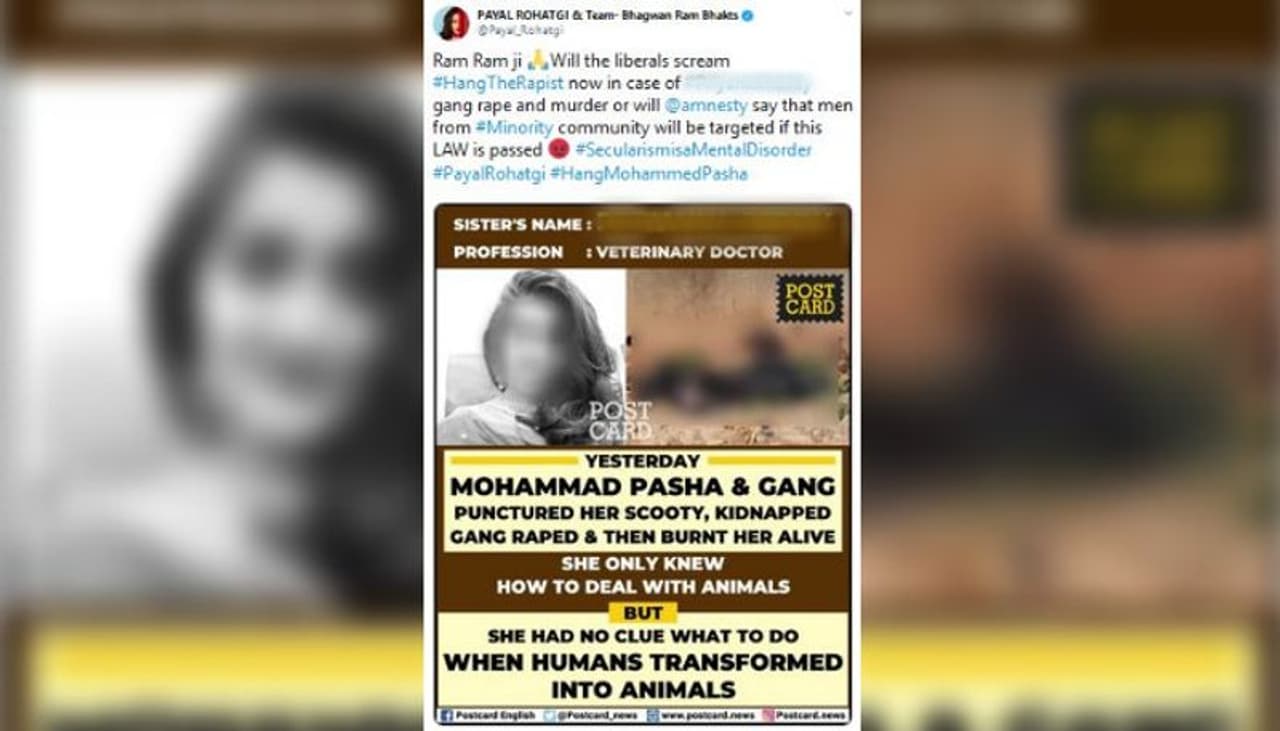 নিজেকে গগর্বিত হিন্দু বলে থাকেন পায়েল রোহাতগি। তাঁর সোশ্যাল মিডিয়া পেজের একেবারে উপরেই সেই কথা লেখা দেখতে পাওয়া যায়। হায়দরাবাদের জঘন্য ঘটনা নিয়ে পায়েল সোশ্যাল মিডিয়ায় লিখেছেন, 'লিবারালরা কি প্রিয়াঙ্কা রেড্ডির গণধর্ষণ ও হত্যার পরও ধর্ষককে ফাসি দাও বলে চিৎকার করবেন না? তাঁরা কি এখনও বলবেন, যদি আইন পাস হয় তবে সংখ্যালঘু সম্প্রদায়কে নিশানা করা হবে?' এই লেখার সঙ্গে একটি ছবি পোস্ট করেছেন তিনি। যেখানে প্রিয়াঙ্কার ছবি দিয়ে, মহম্মদ পাশা ও তার গ্যাঙ প্রিয়াঙ্কাকে ধর্ষণ ও হত্যা করেছে বলে লেখা হয়েছে।