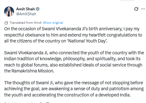 এক্স-এ একটি পোস্টে অমিত শাহ লিখেছেন, "স্বামী বিবেকানন্দ জির জন্মবার্ষিকী উপলক্ষে আমি তাঁকে আমার সশ্রদ্ধ প্রণাম জানাই এবং 'জাতীয় যুব দিবস'-এ দেশের সকল নাগরিককে আমার আন্তরিক শুভেচ্ছা জানাই। স্বামী বিবেকানন্দ জি, যিনি দেশের যুব সমাজকে জ্ঞান, দর্শন এবং আধ্যাত্মিকতার ভারতীয় ঐতিহ্যের সাথে যুক্ত করেছিলেন এবং এর প্রচার বিশ্ব মঞ্চে নিয়ে গিয়েছিলেন, তিনি রামকৃষ্ণ মিশনের মাধ্যমে সমাজসেবার আদর্শও প্রতিষ্ঠা করেছিলেন। লক্ষ্য অর্জনের আগে না থামার বার্তা দেওয়া স্বামীজির চিন্তাভাবনা যুবকদের মধ্যে কর্তব্যবোধ ও দেশপ্রেম জাগিয়ে তুলছে এবং একটি উন্নত ভারত নির্মাণকে ত্বরান্বিত করছে।"