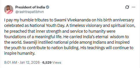 রাষ্ট্রপতি এক্স-এ লিখেছেন, "জাতীয় যুব দিবস হিসেবে পালিত স্বামী বিবেকানন্দের জন্মবার্ষিকীতে আমি আমার বিনম্র শ্রদ্ধা জানাই। একজন কালজয়ী দূরদর্শী এবং আধ্যাত্মিক প্রতীক হিসেবে তিনি প্রচার করেছিলেন যে আত্মিক শক্তি এবং মানবতার সেবাই একটি অর্থপূর্ণ জীবনের ভিত্তি। তিনি ভারতের শাশ্বত জ্ঞানকে বিশ্বের দরবারে পৌঁছে দিয়েছিলেন। স্বামীজি ভারতীয়দের মধ্যে জাতীয় গর্ব জাগিয়ে তুলেছিলেন এবং যুব সমাজকে দেশ গঠনে অবদান রাখতে অনুপ্রাণিত করেছিলেন। তাঁর শিক্ষা মানবতাকে অনুপ্রাণিত করতে থাকবে।"
