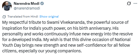 প্রধানমন্ত্রী মোদী এক্স-এ লিখেছেন, "ভারতের যুবশক্তির অনুপ্রেরণার শক্তিশালী উৎস স্বামী বিবেকানন্দকে তাঁর জন্মবার্ষিকীতে আমার সশ্রদ্ধ প্রণাম। তাঁর ব্যক্তিত্ব ও কাজ উন্নত ভারতের সংকল্পে ক্রমাগত নতুন শক্তি যোগাচ্ছে। আমার কামনা, জাতীয় যুব দিবসের এই পবিত্র উৎসব সমস্ত দেশবাসী, বিশেষ করে আমাদের তরুণ সঙ্গীদের জন্য নতুন শক্তি এবং নতুন আত্মবিশ্বাস নিয়ে আসুক।"