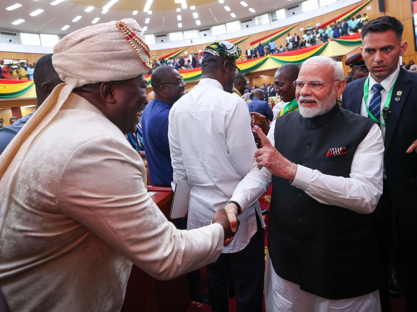 প্রধানমন্ত্রী নরেন্দ্র মোদীর ঘানার সাংসদের সঙ্গে দেখা করেন। দুই সাংসদ বিশেষ নজর কেড়েছিলেন। কারণ তাঁরা মোদীর সঙ্গে দেখা করার জন্যই ভারতীয় পোশাক পরেছিলেন। মোদী অবশ্য সংসদে ভাষণ দেওয়ার সময়ই সেই বিষয় লক্ষ্য করেন। এক সাংসদ ভারতীয় ঐতিহ্যবাসী পাগড়ি পরেই সংসদে উপস্থিত হয়েছিলেন। সঙ্গে পরেছিলে গলাবন্ধ স্যুট। এক মহিলা সাংসদ লাল শাড়ি পরে উপস্থিত হয়েছিলেন সংসদে।