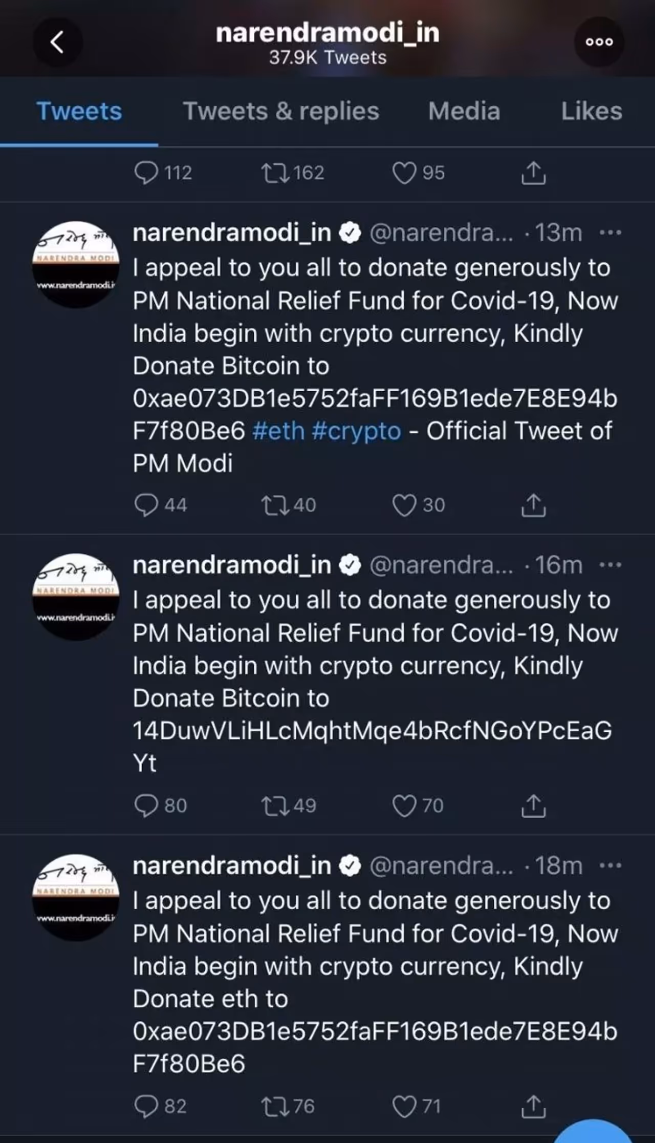 বিটকয়েন সম্পর্কিত একাধিক টুইটে হ্যাকারেরা লেখে, “আমি আপনাদের সবাইকে পিএম ন্যাশনাল রিলিফ ফান্ড ফর কোভিড-১৯ ফান্ডে উদারভাবে অনুদানের আবেদন করছি।” ক্রিপ্টো কারেন্সি দিয়ে অনুদান দেওয়ার কথা বলে হ্যাকারেরা। পরে অবশ্য ওই টুইট মুছে ফেলা হয়।