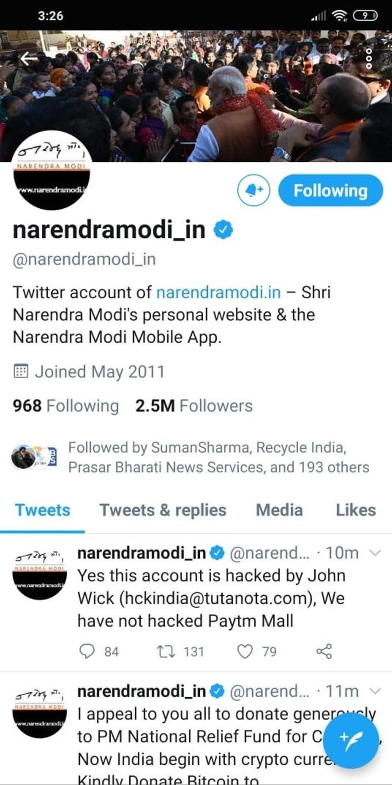 হ্যাক হয়ে গেল নরেন্দ্র মোদীর ট্যুইটার অ্যাকাউন্ট প্রধানমন্ত্রীর ব্যক্তিগত ওয়েবসাইটের ট্যুইটার হ্যান্ডলে হানা  হ্যাক করার পর সেখান থেকে একাধিক ট্যুইট  ক্রিপ্টোকারেন্সির মাধ্যমে রিলিফ ফান্ডে অর্থ সাহায্যের অনুরোধ