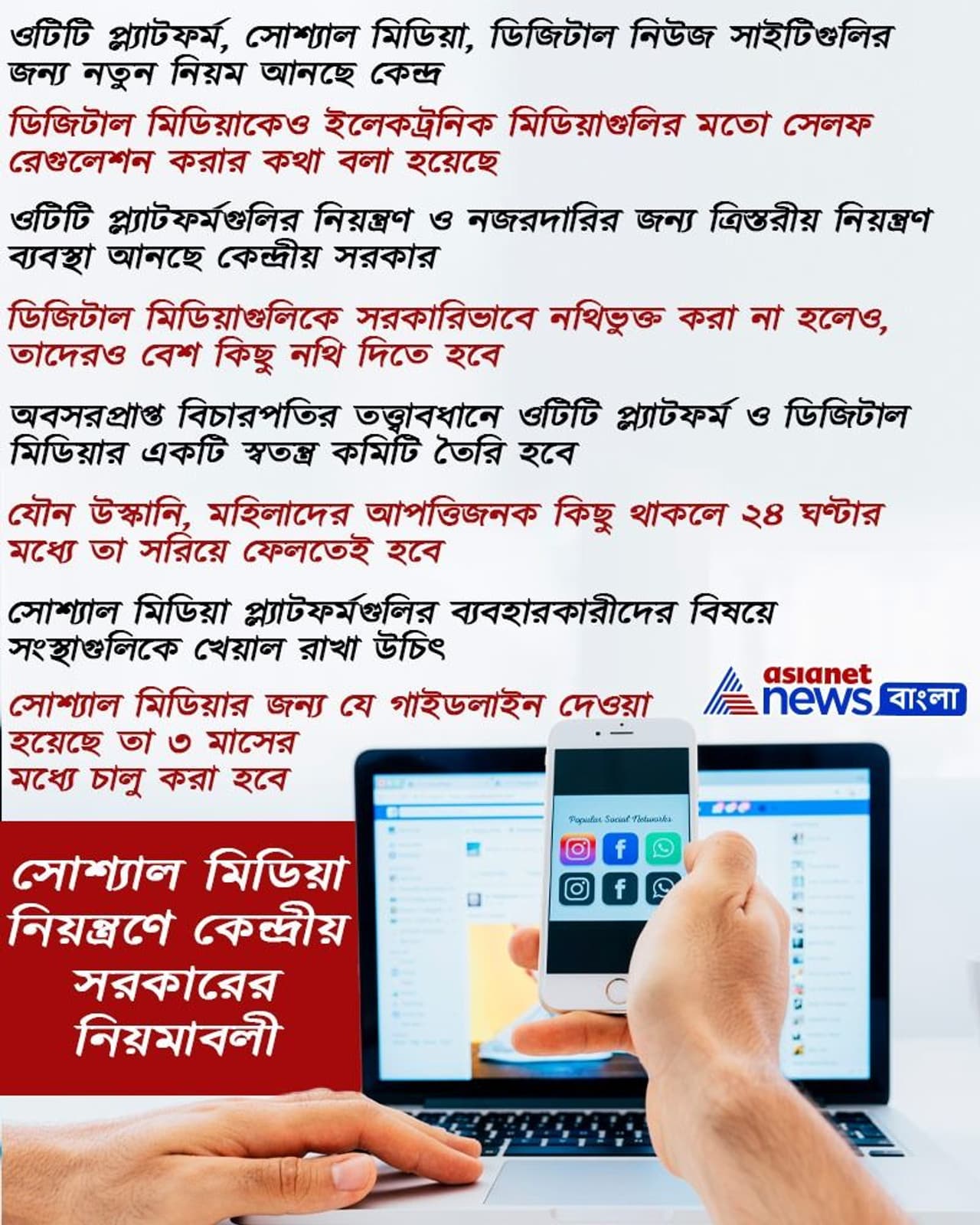 এবার সোশ্যাল মিডিয়া নিয়ন্ত্রণে আরও কড়া হল কেন্দ্রীয় সরকার। ওটিট প্ল্যাটফর্ম, সোশ্য়াল মিডিয়া, ডিজিটাল নিউজ সাইটিগুলির জন্য একাধিক নতুন নিয়ম আনছে মোদী সরকার। এই কথা ঘোষণা করেছেন দুই কেন্দ্রীয় মন্ত্রী রবি শংকর ও প্রকাশ জাভড়েকর। নেটফ্লিক্স-অ্যামাজনের মতো ওটিটি প্ল্যাটফর্ম থেকে শুরু করে ফেসবুক-টুইটারের মতো সোশ্যাল মিডিয়া ইত্যাদি সব প্লাটফর্মগুলির উদ্দেশ্যে গাইডলাইন জারি করল ভারত সরকার। একইসঙ্গে ডিজিটাল মিডিয়াকেও ইলেকট্রিক মিডিয়াগুলির মতো সেলফ রেগুলেশন করার কথা বলা হয়েছে।