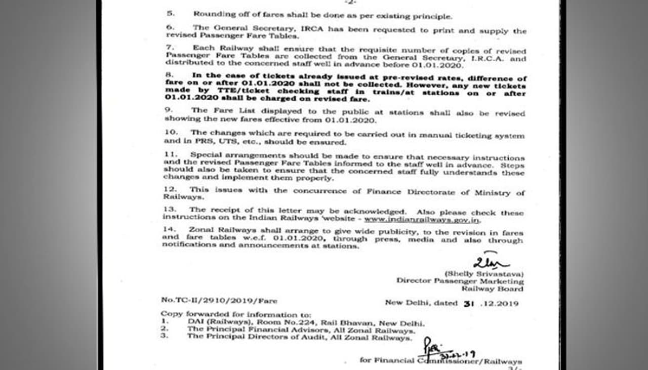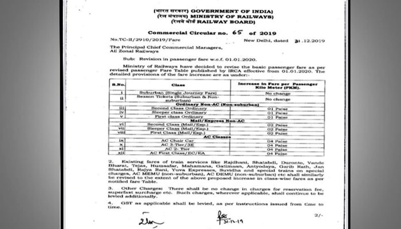 ২০২০ সালের প্রথম দিনেই বাড়ল রেলের ভাড়া। দূরপাল্লার ট্রেনে কিলোমিটার প্রতি ভাড়া বাড়ানো হল। মঙ্গলবারই ভাড়া বৃদ্ধির কথা ঘোষণা করে রেলমন্ত্রক। বাতানুকূল কামরায় সব শ্রেণিতেই গড়ে কিলোমিটার প্রতি ৪ পয়সা হারে ভাড়া বাড়ানো হয়েছে। তবে সাধারণের কথা বিবেচলা করে লোকাল ট্রেনের ভাড়া বাড়ানো হয়নি।
