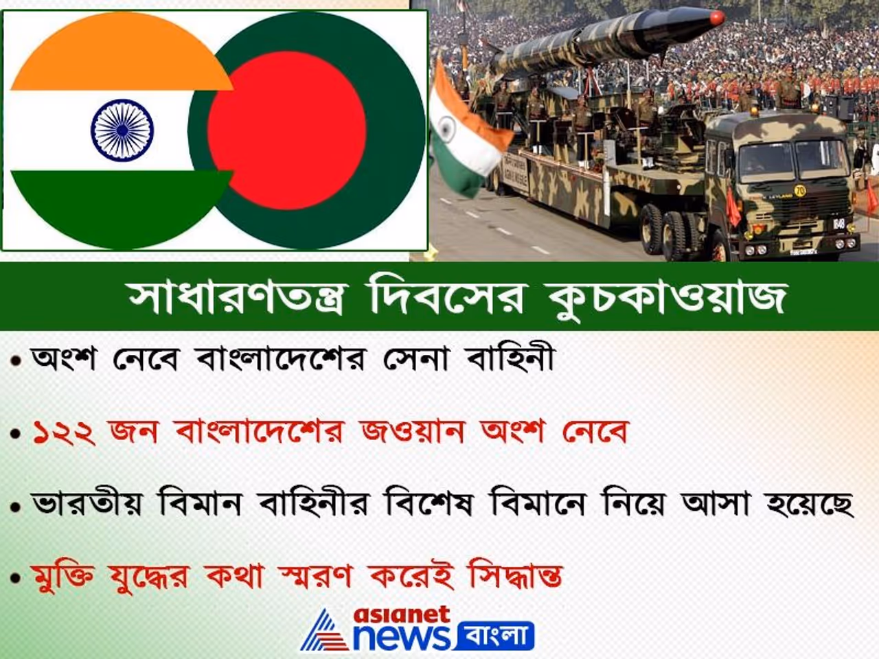 সাধারণতন্ত্র দিবসের অনুষ্ঠানে অংশ নেবে বাংলাদেশ  ১২২ জন সেনা জওয়ান এসেছে সেদেশ থেকে  প্যারেডে অংশে নেবে তারাও  উড়বে ডাকোটা যুদ্ধ বিমান