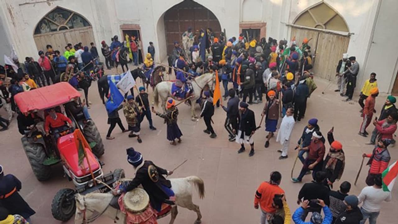 এর মধ্যে আন্দোলনকারীদের একাংশ পৌঁছে যায় দিল্লির ঐতিহাসিক লাল কেল্লায়। লালকেল্লার গম্বুজের উপর থেকে ভারতের জাতীয় পতাকা খুলে ফেলে পতাকার খুঁটিতে শিখ ধর্মীয় পতাকা, নিশান সাহেব লাগিয়ে দেয়। পুলিশ ও কৃষকদের মধ্যে সংঘর্ষে দুর্গের ভেতরে অন্যান্য অংশেরও ক্ষতি হয়। দিল্লি পুলিশের মতে এই ঘটনায় ৩৯৪ জন পুলিশ সদস্য এবং হাজার হাজার কৃষক আহত হয়েছিলেন। দিল্লি পুলিশের ৩০ টি গাড়ি ক্ষতিগ্রস্ত হয়েছিল। স্বরাষ্ট্রমন্ত্রী অমিত শাহ, দিল্লিতে অতিরিক্ত আধাসামরিক বাহিনী মোতায়েন করেন। কৃষক সংগঠনগুলির পক্ষ থেকে হিংসায় উস্কানি দেওয়ার জন্য এবং লাল কেল্লায় একটি নিশান সাহেব পতাকা উত্তোলনের জন্য অভিনেতা তথা সমাজকর্মী দীপ সিধু এবং গ্যাংস্টার থেকে সমাজকর্মী হওয়া লাখা সিধানাকে দোষারোপ করেছিল।