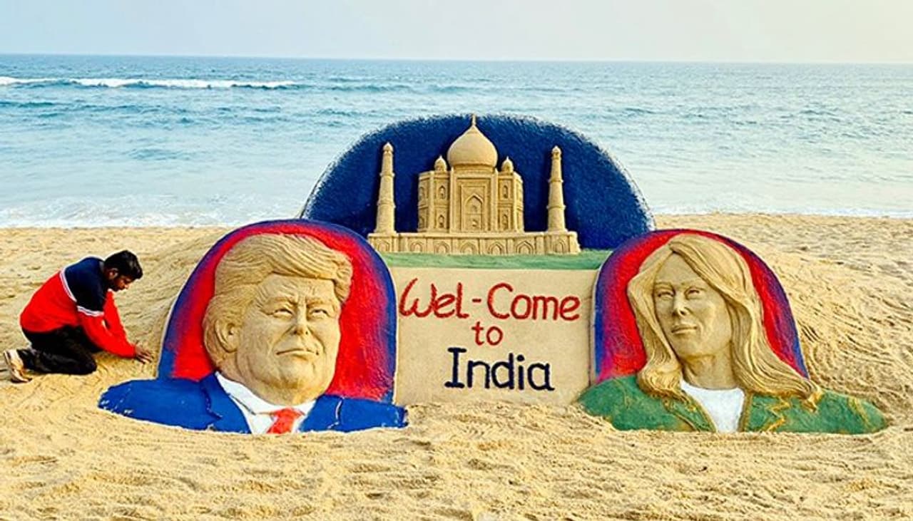পুরী সৈকতে তৈরি করা হল এমনই এক চিত্র। যেখানে মার্কিন প্রেসিডেন্টকে স্বাগত জানানোর প্রয়াস নজর কাড়ল নেটিজেনদের। মুহূর্তে সেই ছবি ছড়িয়ে পড়ল নেট দুনিয়ায়। মানস সাহো এই চিত্রটি তৈরি করেছেন পুরীতে। ছবি শেয়ার করে শিল্পী লেখেন, ওড়িশা স্বাগত জানাচ্ছে ট্রাম্পকে। কেবল এখানেই নয়, রাজস্থানেও ধরা দিল একই চিত্র। পুস্করেও ধরা দিল একই ছবি।