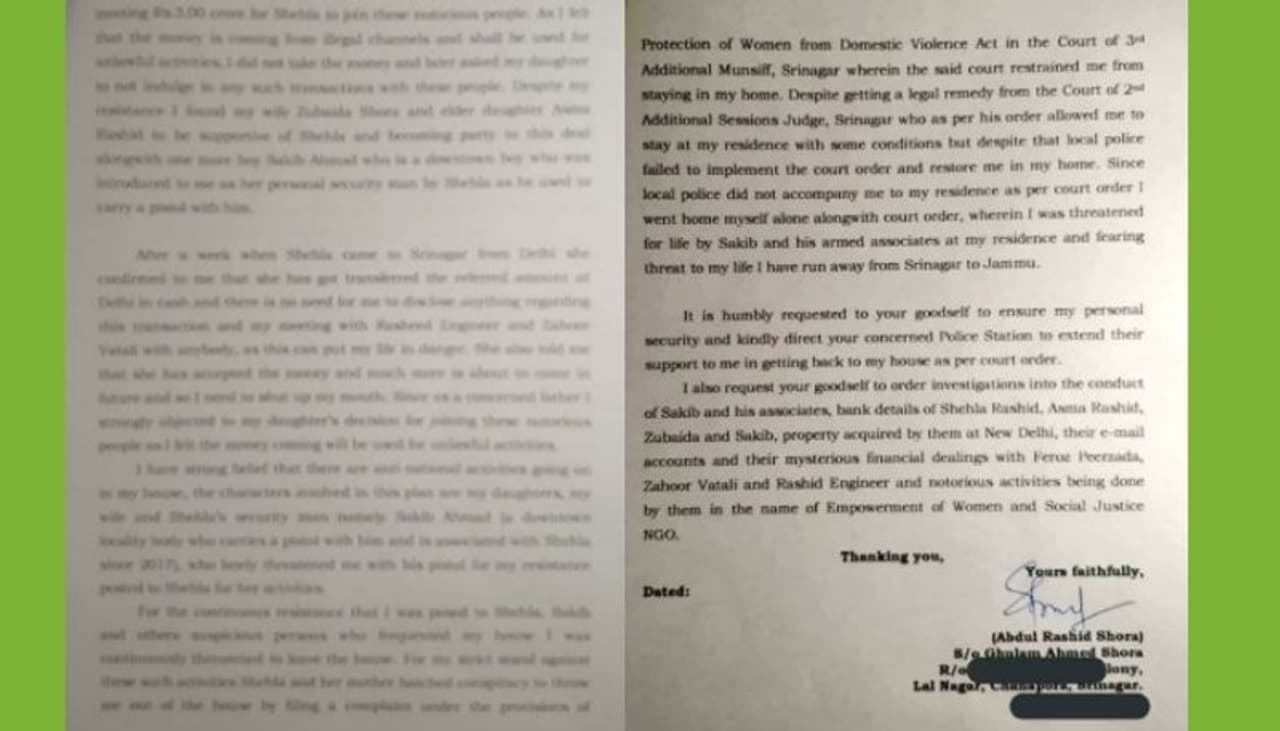 আব্দুল রশিদ সোরা জম্মু ও কাশ্মীরের ডিজিপিকে জানিয়েছেন শায়লা রসিদ রাজনীতিতে যোগ দেওয়ার সঙ্গে সঙ্গেই সবকিছু বদলে যেতে থাকে। তাঁকে, তাঁর স্ত্রী জুবাইদা ও বড়মেয়ে আসমাকে ক্রমাগত হুমকির মুখোমুখি হতে হয়। তিনি বলেন সালটা ছিল ২০১৭। সেই সময় শেহলা রশিদ ছিলেন দিল্লি। জেনএনইউতে সমাজবিজ্ঞানের পিএইটডি করছিলেব। আর পরীক্ষা শেষ হওয়ার ঠিক দুই মাস আগে শায়লার বাবা আব্দুল রসিদকে ডেকে পাঠায় জুহুর ওয়াতালি ও রশিদ ইঞ্জিনিয়ার (প্রাক্তন বিধায়ক)। তাঁরা আব্দুল রসিদকে জানিয়েছিলেন তাঁরা নতুন একটি রাজনৈতিক দলের পত্তন করছেন যার নাম জম্মু কাশ্মীর পিপিলস পার্টি বা জেকেপিপি। শায়লাকে তাঁরা তাঁদের দলের সদস্য করতে চান। আর শায়লার জন্য তাঁরা তিন কোটি টাকাও রেখেছেন। আব্দুল রসিদের প্রশ্ন কোথা থেকে এল এই টাকা? যদিও সেই সময় তিনি তাদের থেকে কোনও টাকা গ্রহণ করেননি বলেও জানিয়েছেন।