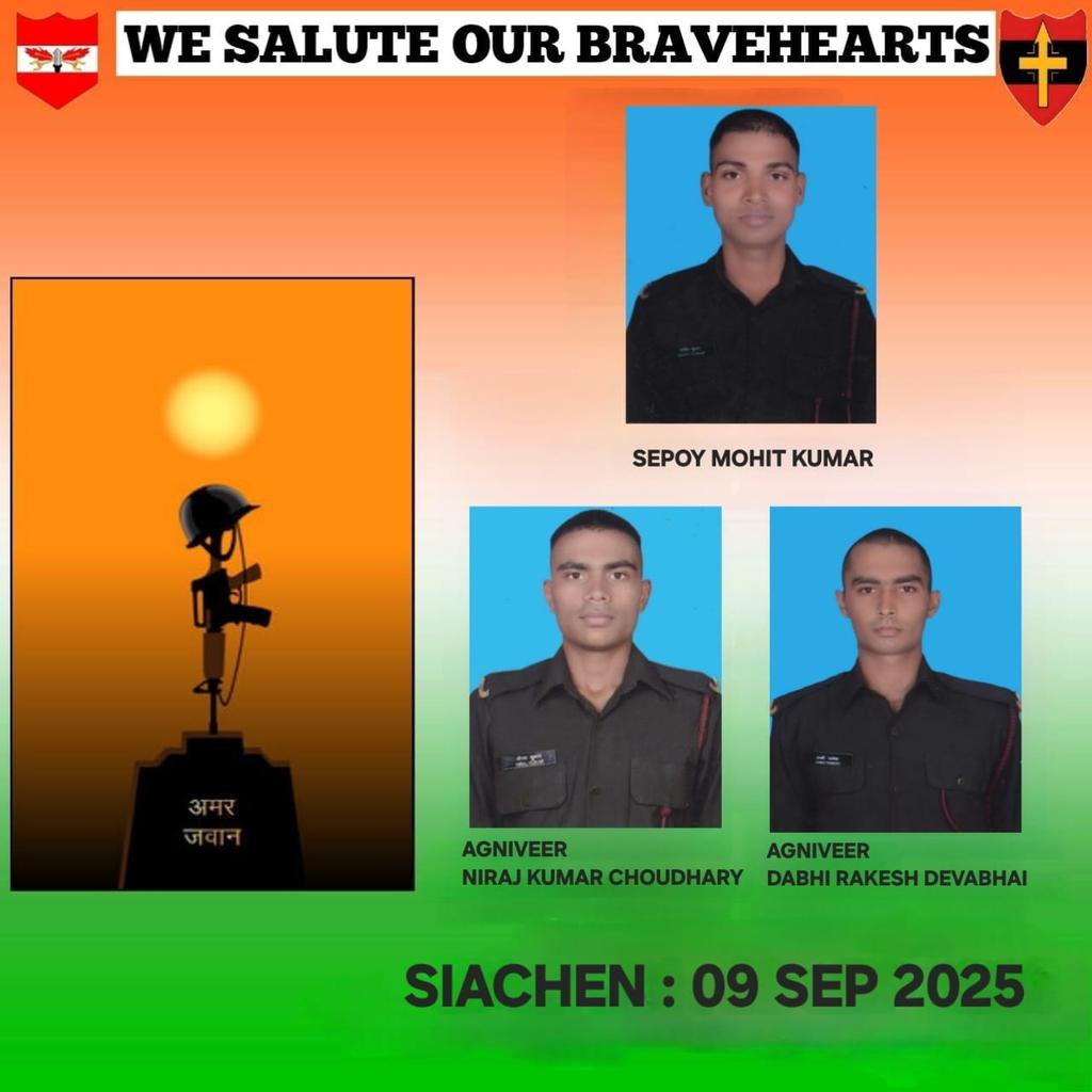 সূত্রের খবর অনুযায়ী, রবিবার, ৭ সেপ্টেম্বর সিয়াচেন হিমবাহ এলাকায় ভারতীয় সেনাবাহিনীর একটি শিবির তুষার ধসের কবলে পড়ে। এখনও পর্যন্ত তিনজন সৈন্যের মরদেহ উদ্ধার করা হয়েছে। "GOC, ফায়ার অ্যান্ড ফিউরি কর্পস এবং সকল স্তরের সেনারা সিপাহী মোহিত কুমার, অগ্নিবীর নিরজ কুমার চৌধুরী এবং অগ্নিবীর দাভি রাকেশ দেবভাইকে স্যালুট জানাচ্ছেন, যারা ৯ সেপ্টেম্বর ২০২৫ -এ সিয়াচেনে দায়িত্ব পালনের সময় সর্বোচ্চ ত্যাগ স্বীকার করেছেন এবং শোকাহত পরিবারের প্রতি গভীর সমবেদনা জানাচ্ছেন," ভারতীয় সেনাবাহিনীর ফায়ার অ্যান্ড ফিউরি কর্পসের অফিসিয়াল এক্স অ্যাকাউন্টে পোস্ট করা হয়েছে।