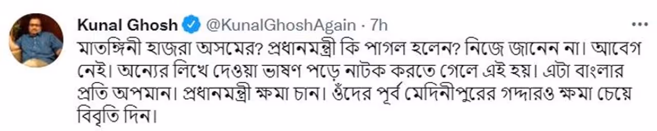এ প্রসঙ্গে টুইটারে তৃণমূল মুখপাত্র কুণাল ঘোষ লেখেন, "মাতঙ্গিনী হাজরা অসমের? প্রধানমন্ত্রী কি পাগল হলেন? নিজে জানেন না। আবেগ নেই। অন্যের লিখে দেওয়া ভাষণ পড়ে নাটক করতে গেলে এই হয়। এটা বাংলার প্রতি অপমান। প্রধানমন্ত্রী ক্ষমা চান। ওঁদের পূর্ব মেদিনীপুরের গদ্দারও ক্ষমা চেয়ে বিবৃতি দিন।"