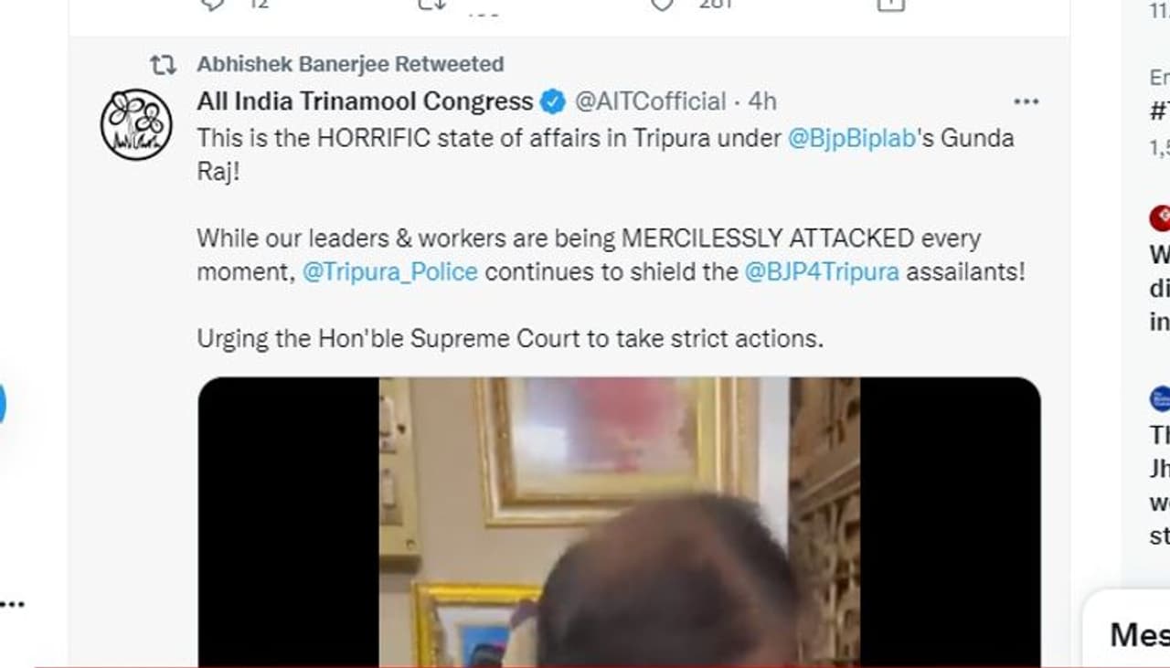 রবিবার তৃণমূল কংগ্রেস নেতা অভিষেক বন্দ্যোপাধ্যায় সোশ্যাল মিডিয়ায় তৃণমূল কংগ্রেসের একটি টুইট রিটুইট করে। সেখানে তিনি বলেছেন, ত্রিপুরার অবস্থায় ভয়াবহ। বিজেপির বিপ্লব দেবের গুন্ডারাজ চলছে সেখানে। তিনি অভিযোগ করে আরও জানিয়েছেন ত্রিপুরার তাদের নেতা কর্মীরা প্রতি মুহূর্তে নির্মমভাবে হামলার শিকার হচ্ছে। তিনি অভিযোগ করে বলেছেন ত্রিপুরা বিজেপি আততীয়। আর ত্রিপুরা পুলিশ তাদের ঢাল হিসেবে কাজ করছে। দলীয় কর্মীদের আক্রান্ত হওয়ার ঘটনার একটি ভিডিও পোস্ট করে অভিষেক সুপ্রিম কোর্টকে কঠোর ব্যবস্থা নেওয়ারও আর্জি জানিয়েছেন।