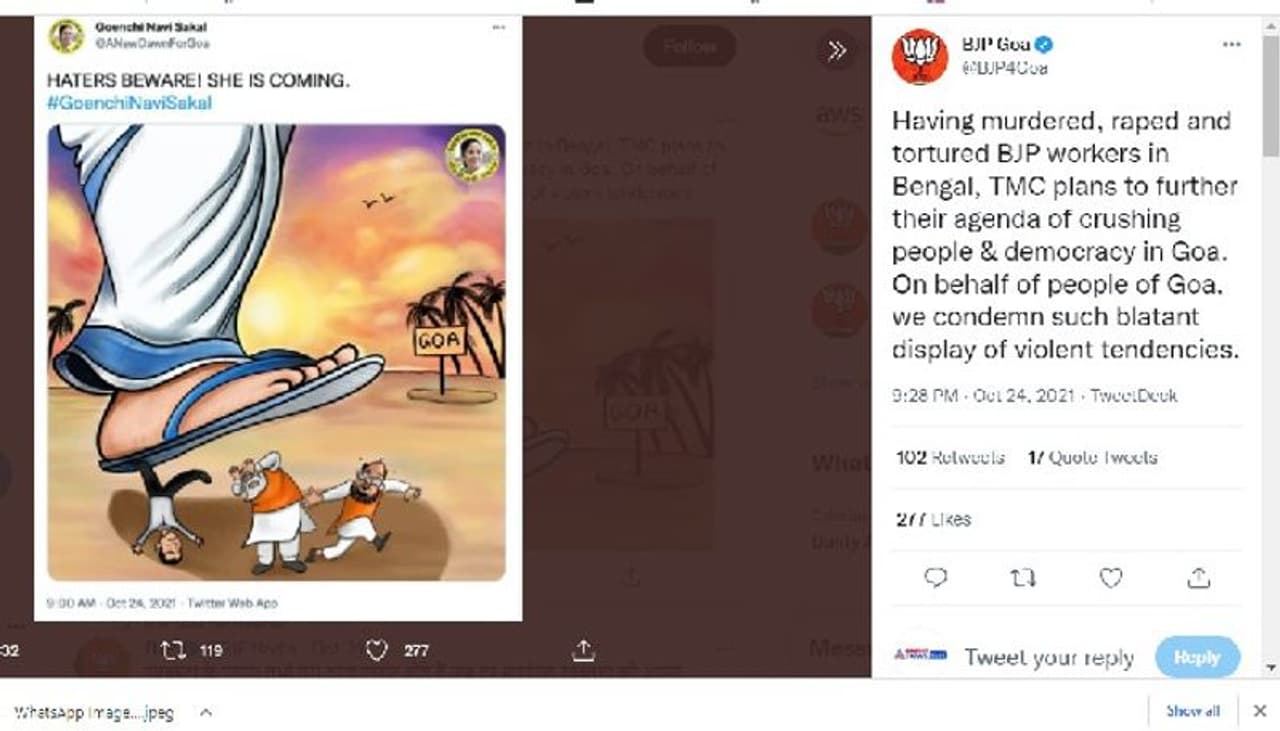 রবিবারই বিজেপির গোয়া ইউনিট দাবি করেছে তৃণমূল কংগ্রেস মমতা বন্দ্যোপাধ্য়ায়ের একটি কার্টুন ছবি পোস্ট করেছে। ছবিটিতে দেখা যাচ্ছে তৃণমূল নেত্রী গোয়াতে প্রধানমন্ত্রী নরেন্দ্র মোদী, স্বরাষ্ট্রমন্ত্রী অমিত শাহ ও গোয়ার মুখ্যমন্ত্রী প্রমোদ সাওয়ান্তকে পায়ের নিচে পিষে ফেলার চেষ্টা করছেন। সেই ছবি পোস্ট করে বিজেপির গোয়া ইউনিট লিখেছে, 'বাংলায় বিজেপি কর্মীদের খুন, ধর্ষণ ও নির্যাতনের পর তৃণমূল গোয়ার জনগণ ও গণতন্ত্রকে পিষ্ট করার জন্য তাদের এজেন্ডাকে আরও এগিয়ে নিয়ে যেতে চাইছে। গোয়ার জনগণেতর তরফে এজাতীয় হিংসাত্মক প্রবণতাকে আমরা নিন্দা জানাই।' গোয়ার মুখ্যমন্ত্রী প্রমোদ সাওয়ান্তের অফিস থেকে একটি বিবৃতি জারি করা হয়েছে। তাতে দাবি করা হয়েছে, মমতা বন্দ্যোপাধ্যায়ের দলই এই ছবিটি টুইট করেছে। মুখ্যমন্ত্রীর দফতর থেকে টুইটের স্ক্রিন শটও প্রচার করা হয়েছে।