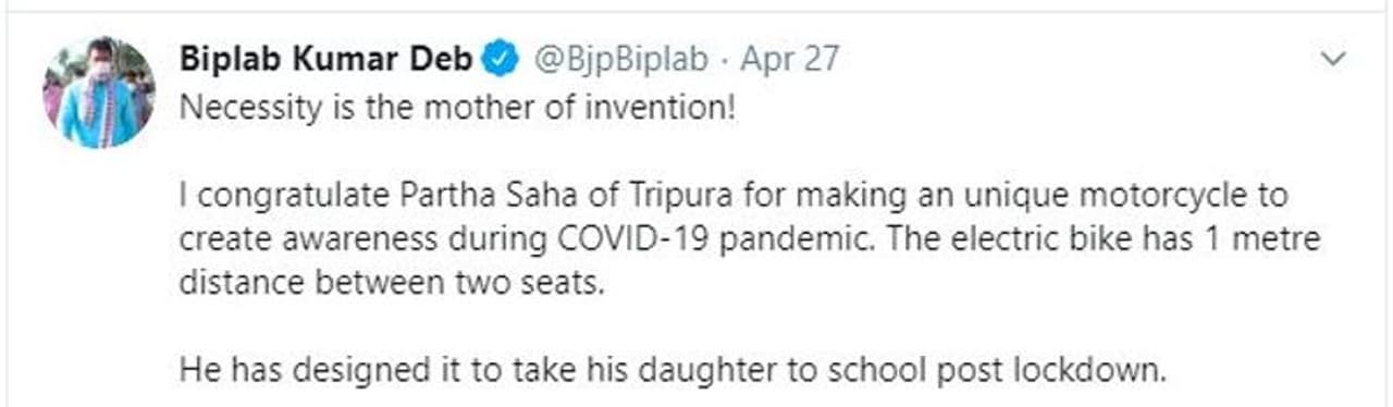 একমাসের বেশি সময় ধরে চলছে লকডাউন। শুক্রবার আরও দুই সপ্তাহের জন্য এর মেয়াদ বাড়ানো হয়েছে। তৃতীয় দপার লকডাউনে অনেকটাই শিথিল হচ্ছে কড়াকড়ি। রাস্তায় বের হলে নিরাপদ দূরত্ব বজায় রাখা সমস্যার। বিশেষ করে বাইক-স্কুটারের মতো যানবাহনে তো চালক এবং অপর যাত্রী একেবারে গা ঘেসাঘেসি করে বসে থাকেন। তাই ত্রিপুরার এক টিভি মেকানিক লকডাউনে বাড়িতে বসে মাথা খাটিয়ে তৈরি করে ফেললেন 'সোশ্য়াল ডিসট্যান্সিং বাইক' বা 'সামাজিক দূরত্বের বাইক'।