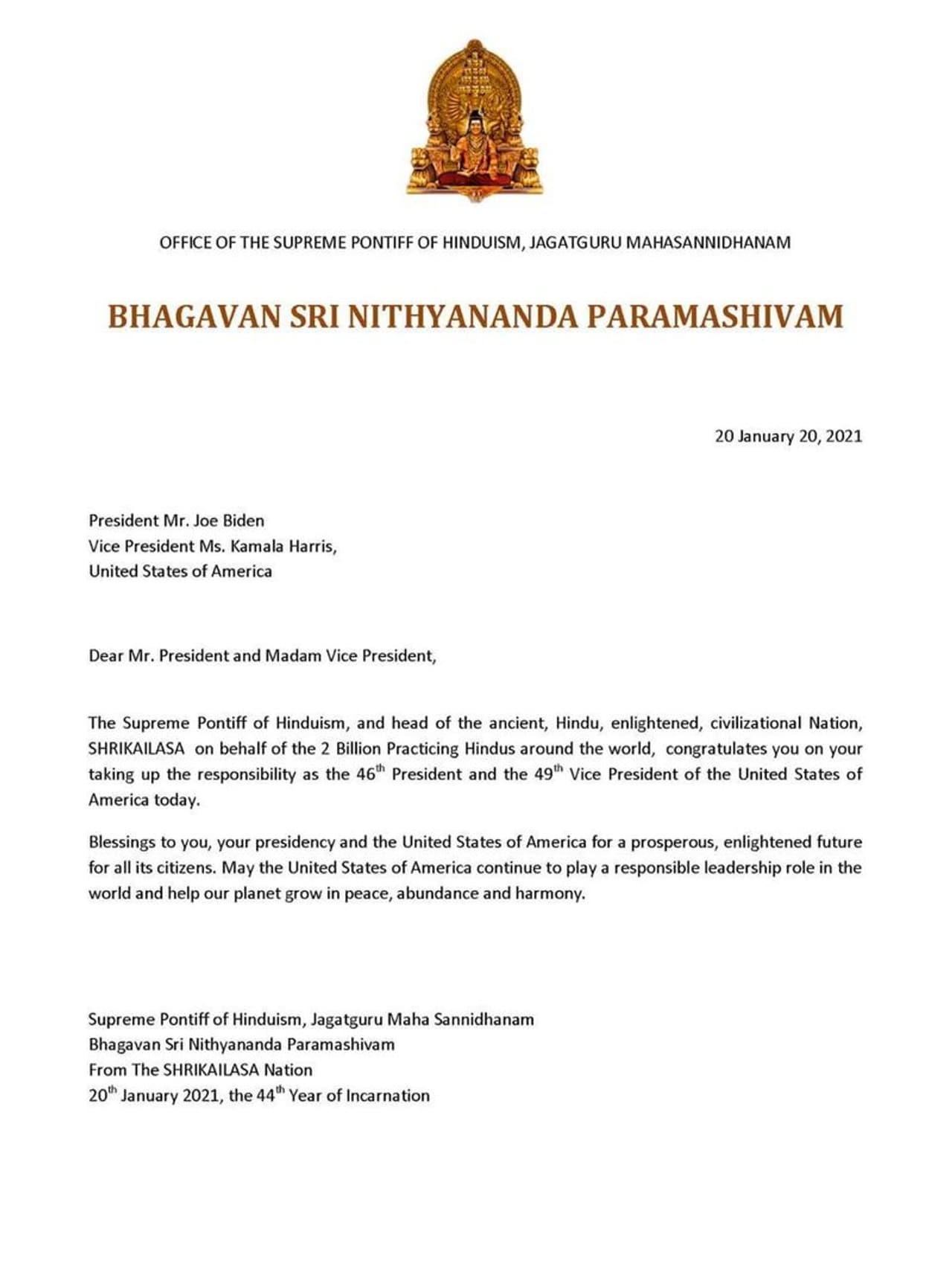 বাইডেন-হ্যারিসকে লেখা চিঠিতে নিত্যানন্দকে হিন্দু ধর্মের সর্বোচ্চ গুরু বলে অভিহিত করা হয়েছে। জো বাইডেন ও কমলা হ্যারিসকে ক্ষমতা গ্রহণের জন্য অভিনন্দন জানানো হয়েছে। সেই সঙ্গে বলা হয়েছে, বিশ্বে ছড়িয়ে থাকা ২০০ কোটি হিন্দুদের পক্ষ থেকে এই অভিনন্দন জানাচ্ছেন নিত্যানন্দ পরমশিবম। বিশ্বে আমেরিকার নেতৃত্ব অব্যাহত থাকবে এমনটাই কামনা করা হয়েছে ওই চিঠিতে।