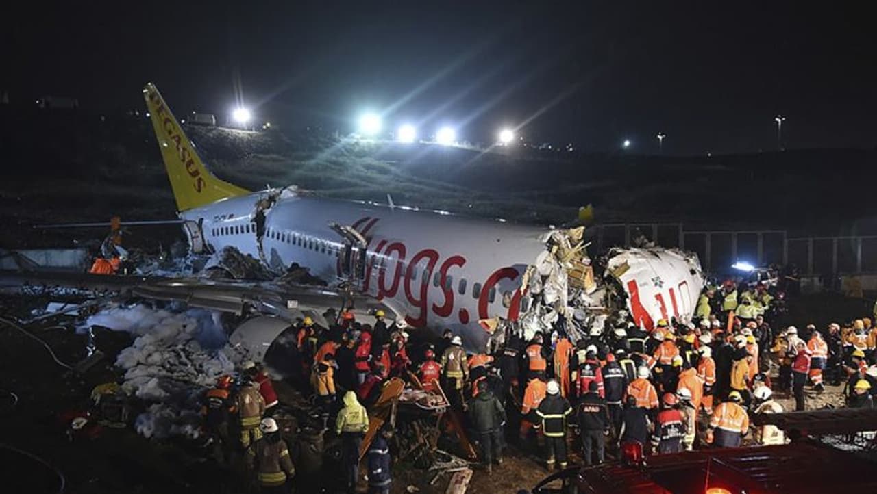 ঘটনাস্থলের ভিডিও ফুটে থেকে দেখা যাচ্ছে, তুর্কি বিমান সংস্থা পেগাসাসের বিমানটি রানওয়ে থেকে ছিটকে পড়ার পর তিন টুকরো হ.ে যায়। বিমানের এক বিশাল ফাটল দিয়ে যাত্রীদের সরিয়ে নিয়ে যাওয়া হয়।